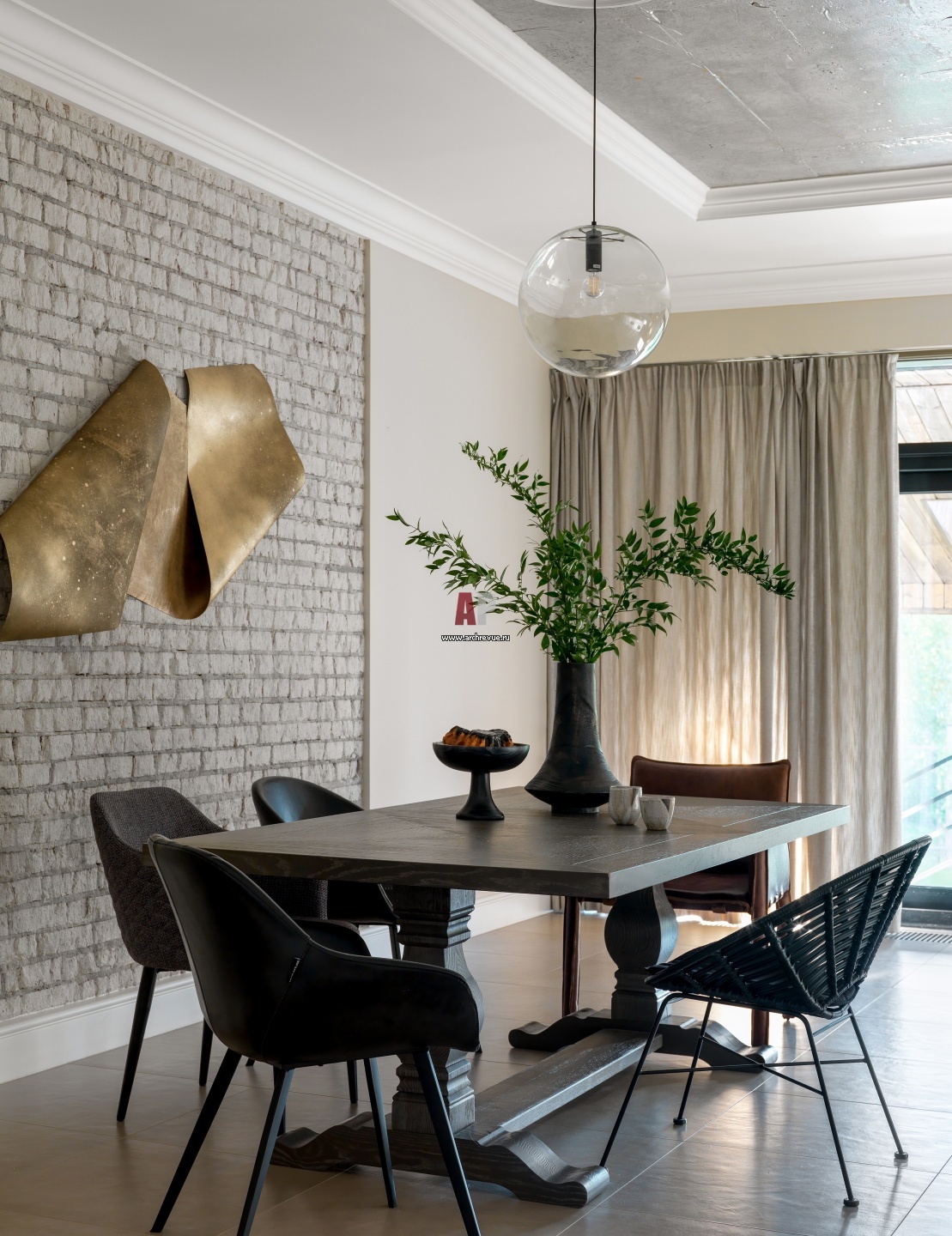 Монохромный интерьер в стиле лофт с современным искусством и винтажной мебелью.