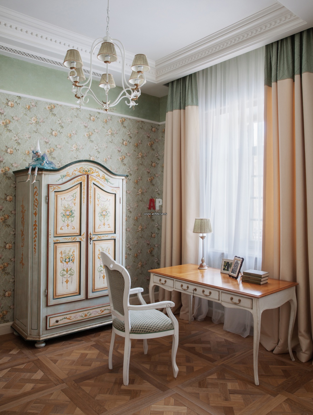 В интерьере детской использованы нежные зеленые и голубые оттенки, а также расписная мебель от Vittorio Grifoni.