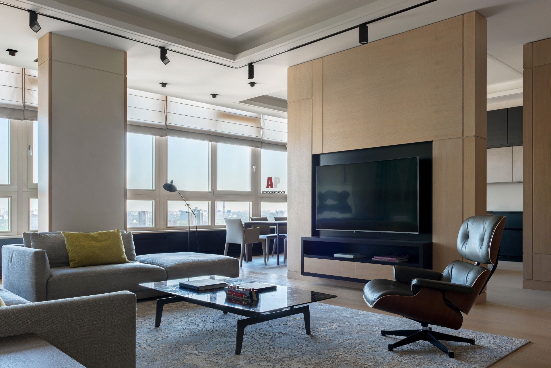 Гостиная отделена от кухни перегородкой, облицованной панелями из выбеленного дуба. Она имеет двойную функцию: со стороны гостиной в нее вмонтирована плазма ТВ и акустическая техника, со стороны кухни – это стеклянный шкаф для посуды.