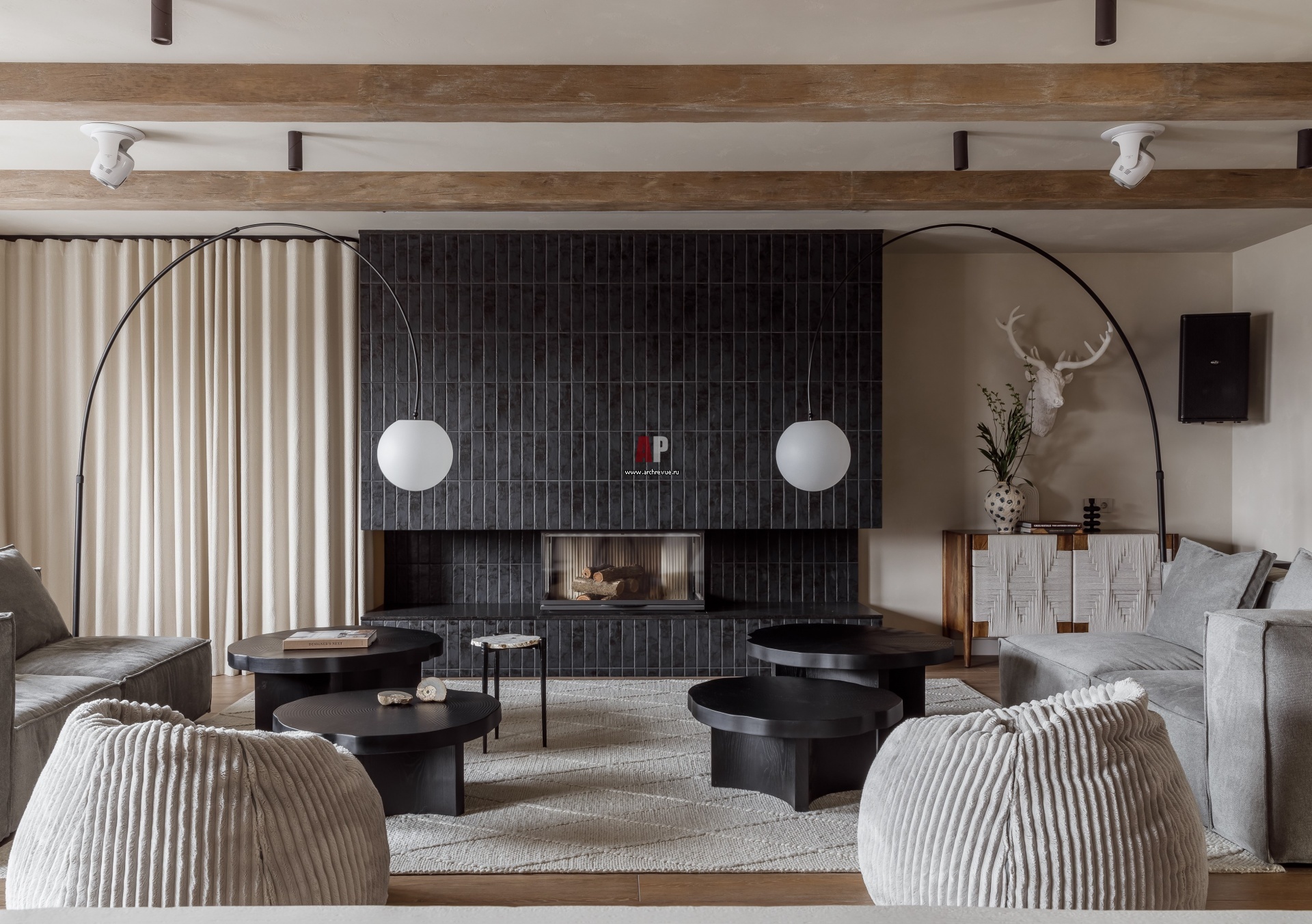 Диваны, Classico Italiano, модель «Сидней». Дополнительные мягкие места формируют мобильные пуфы-мешки. Столик со столешницей из агата и ковер, Art de Vivre. Тонированные в черный цвет столешницы журнальных столов украшены брашировкой, имитирующей древесные годичные кольца.