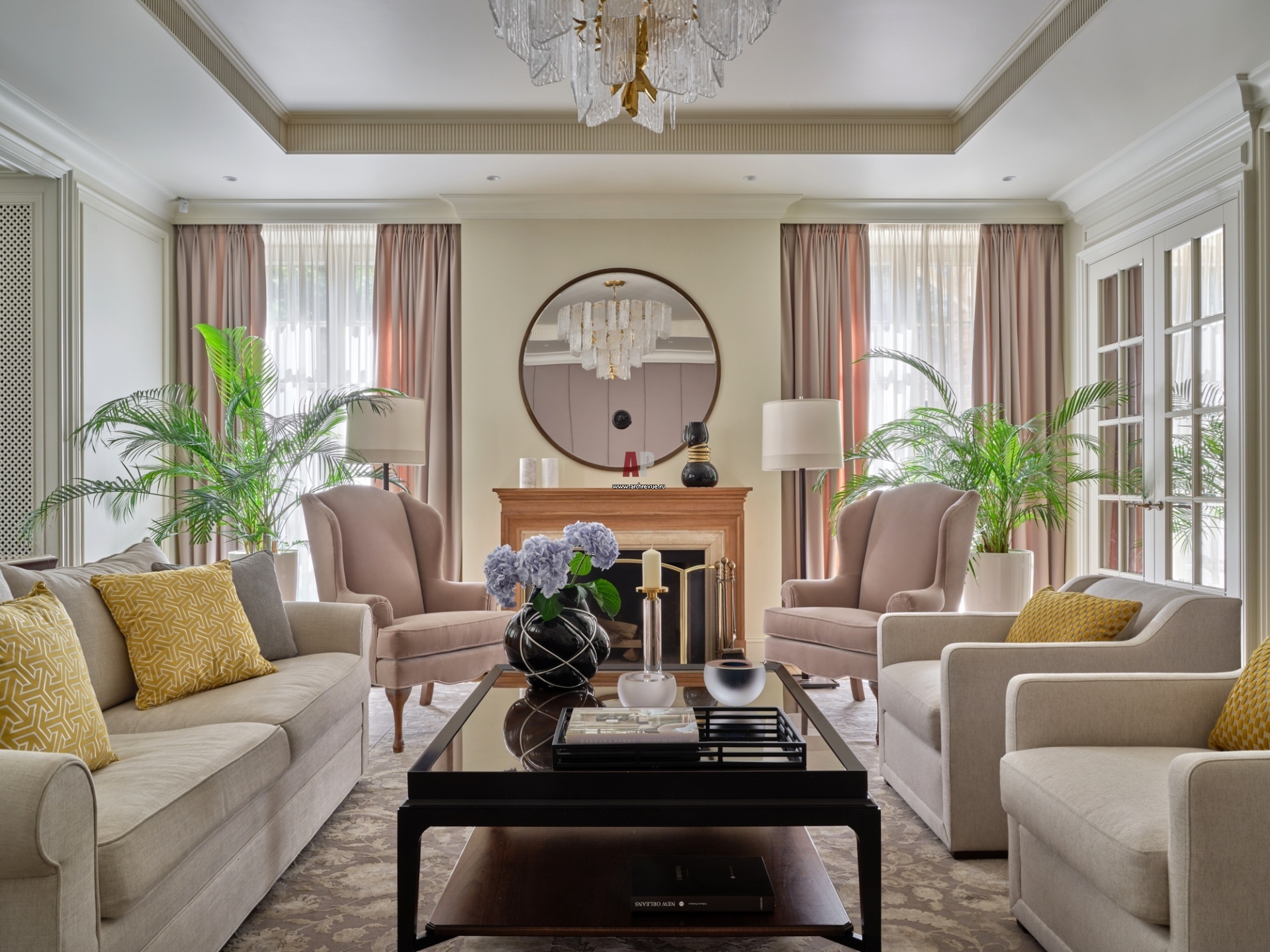 Каминная группа в гостиной имеет симметричную композицию. Диваны, Thomasville. Кресла, Baker. Каминные кресла и журнальный столик, Century Furniture. Кресла, Hickory Chair. Люстра, Corbett Lighting.