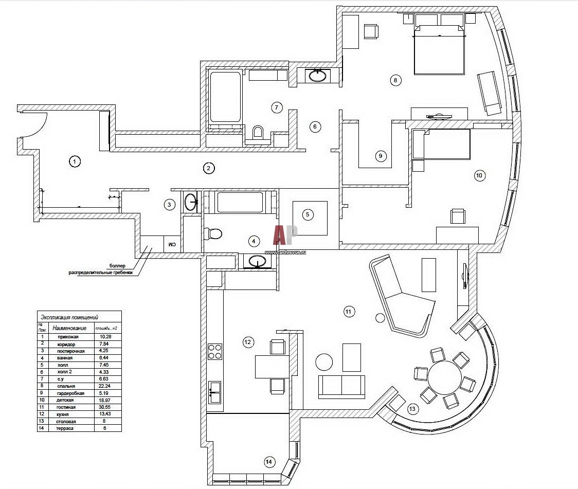 Планировка трехкомнатной панорамной квартиры для молодой семьи. Общая площадь - 153 кв. м.