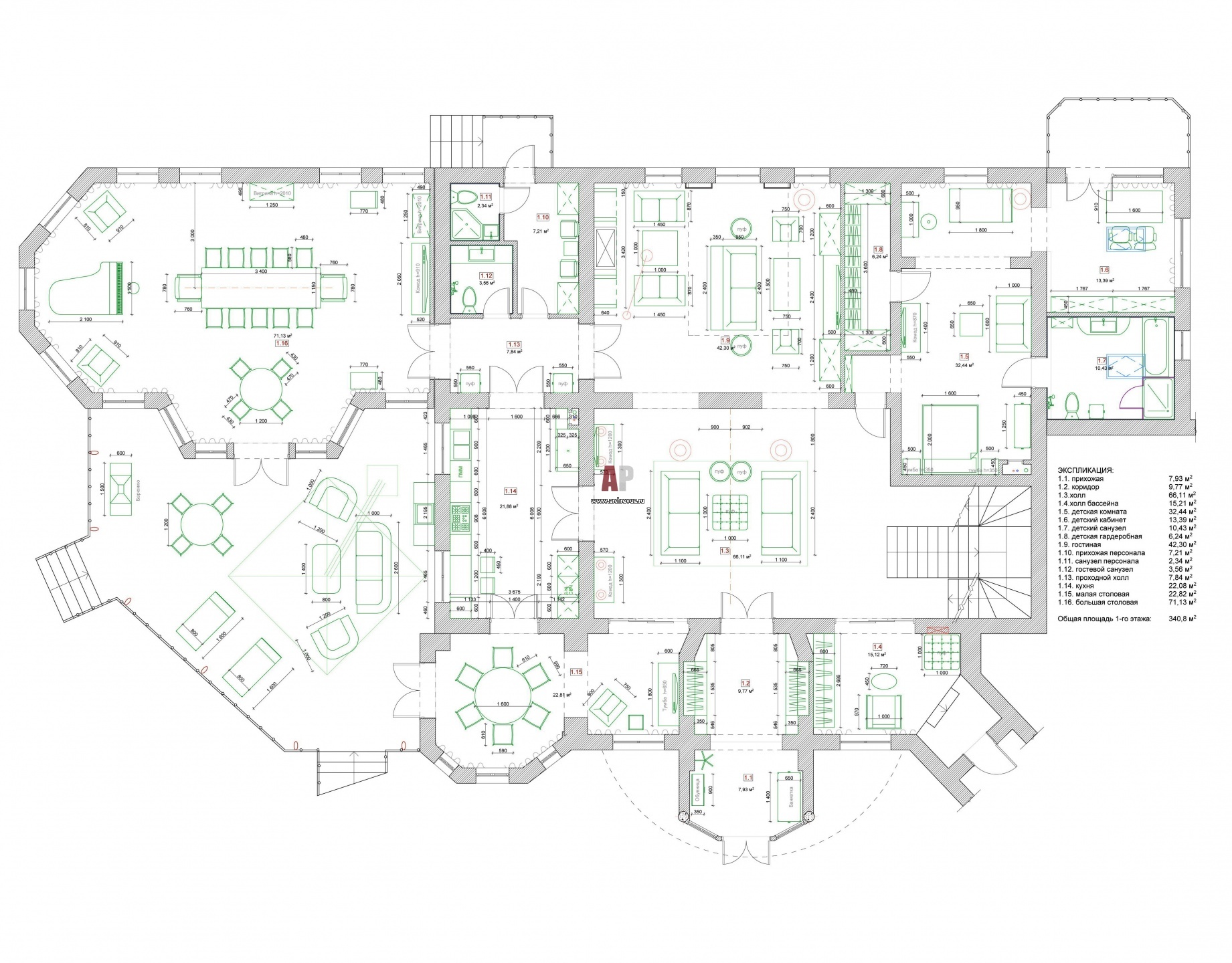 Планировка 1 этажа 3-х этажного дома. Общая площадь – 720 кв. м.