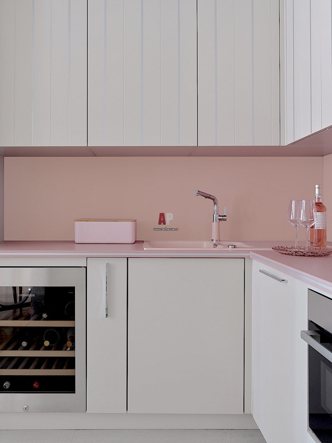 На фоне активных стеновых панелей кухня выглядит нейтрально. Она расположена в нише и имеет геометрический декор.