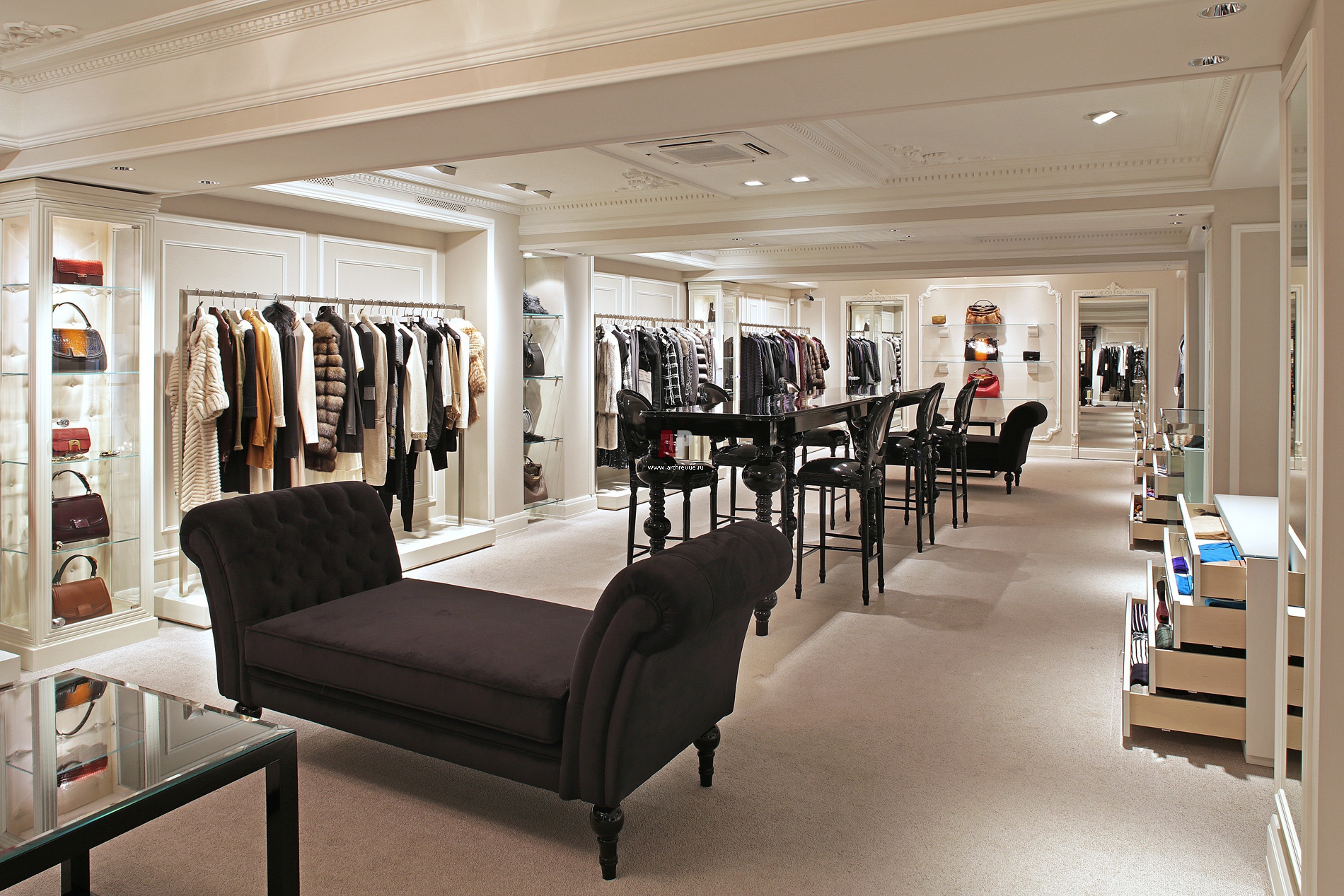 В центре антресольного этажа находится барная стойка из черного цвета под лаком. Она служит как местом для отдыха посетителей, так и зоной для презентации и экспонирования товаров.