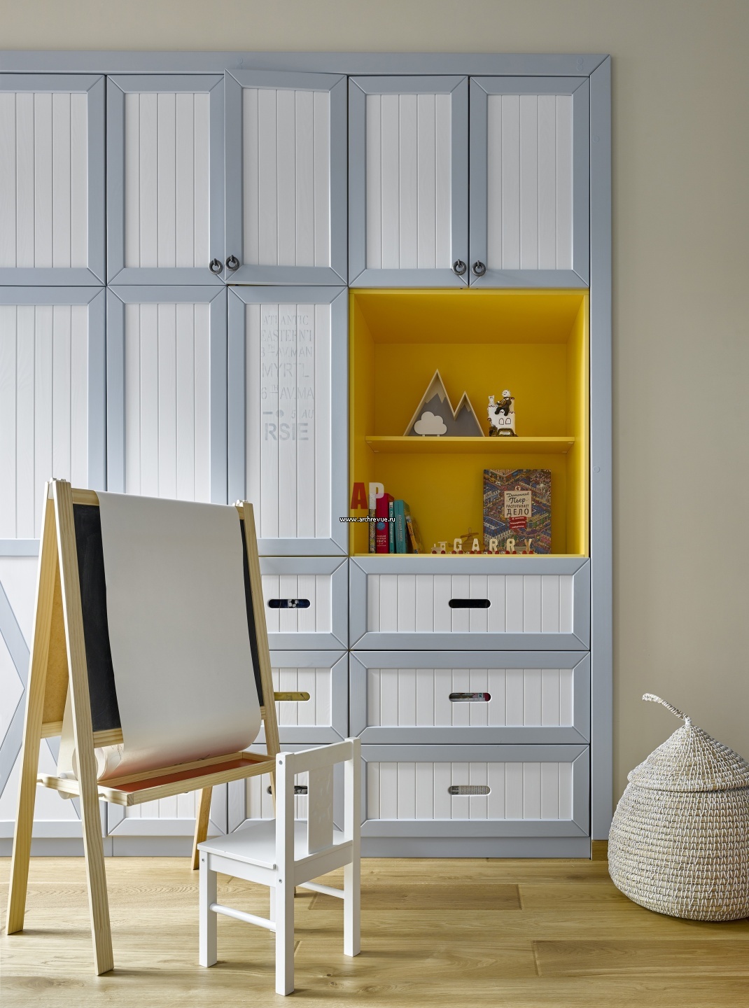 Технологичная квартира на Пречистенской набережной. Интерьер детской. Система хранения с морской тематикой сделана на заказ.