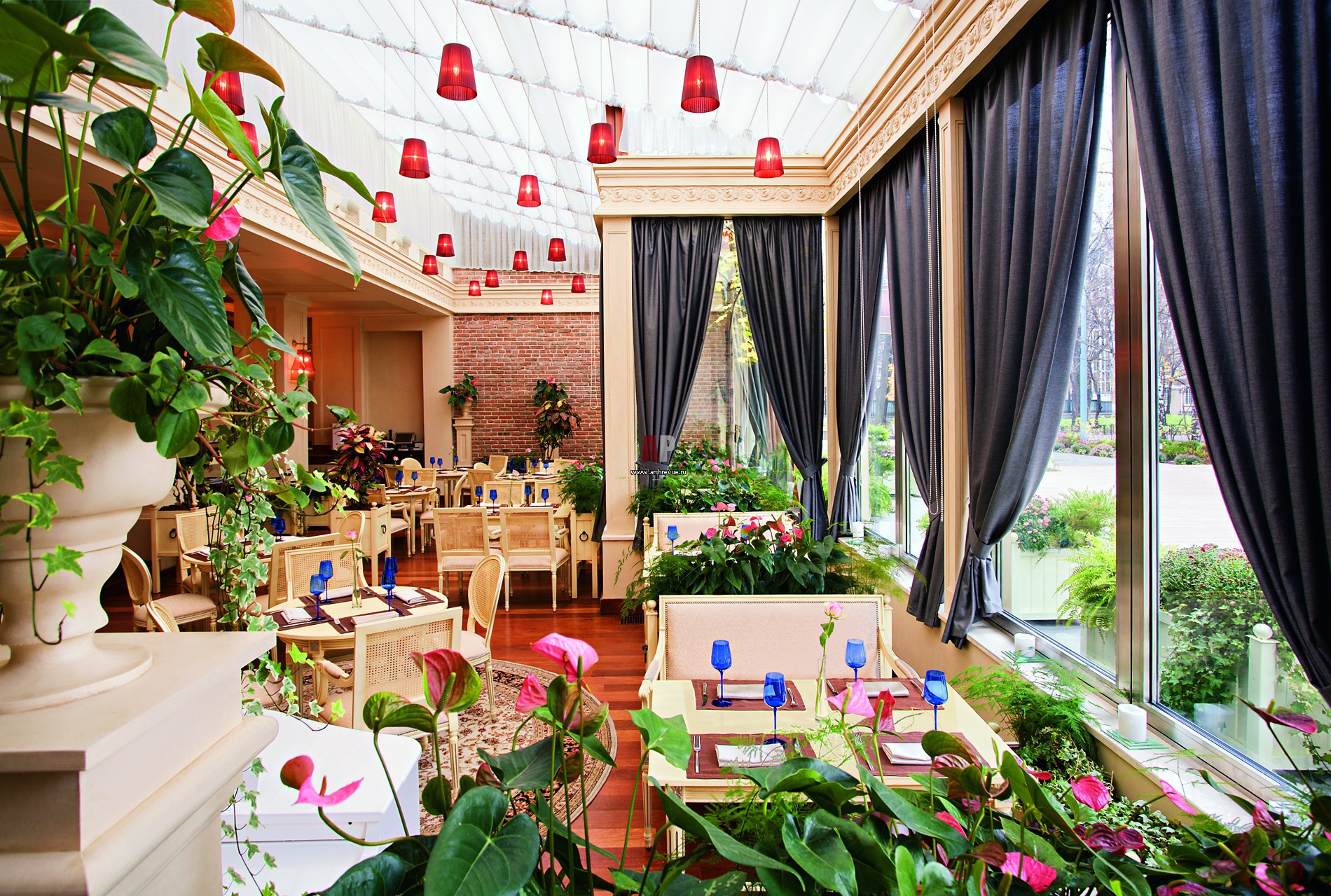 Высокий, пронизанный дневным светом объем основного зала со стеклянной крышей и множеством живых растений похож на зимний сад. Его облик формирует кирпичная кладка стен, ритм высоких окон, подчеркнутый по-домашнему распахнутыми шторами, теплые декоративные отделки, флордизайн.