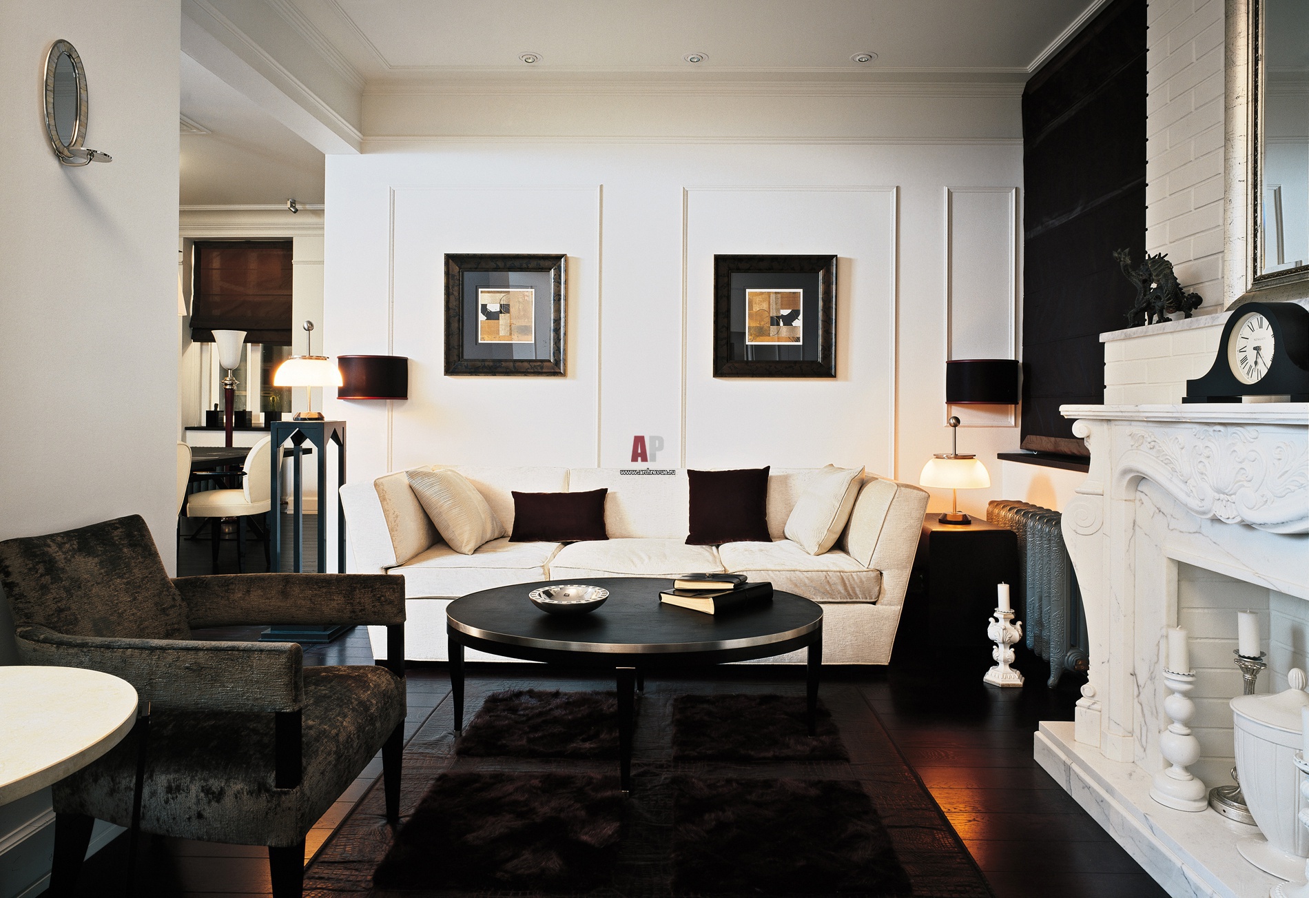Интерьер общественной зоны квартиры решен по принципу студии. Зона гостиной существует в одном объеме с прихожей и планировочно отделена от нее только колонной и двумя потолочными балками. Стены частично облицованы плиткой «под кирпич» и выкрашены в белый цвет.