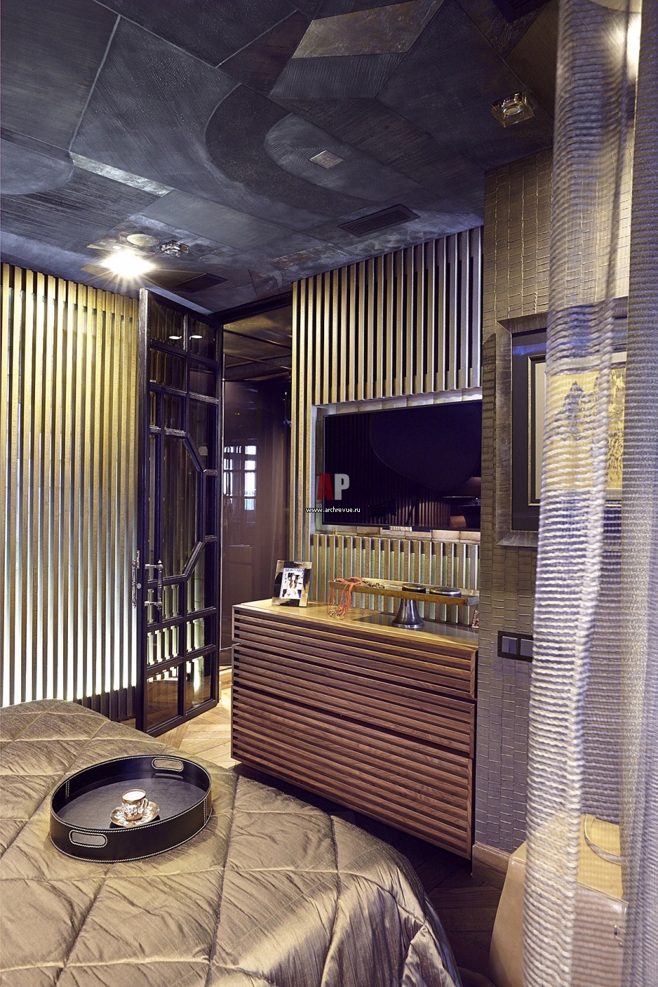 Интерьер спальни. Ниши зашиты реечными панелями, исполненными в типичной для Юго-восточной Азии технике золочения. С ними рифмуется отделка фасада комода.
