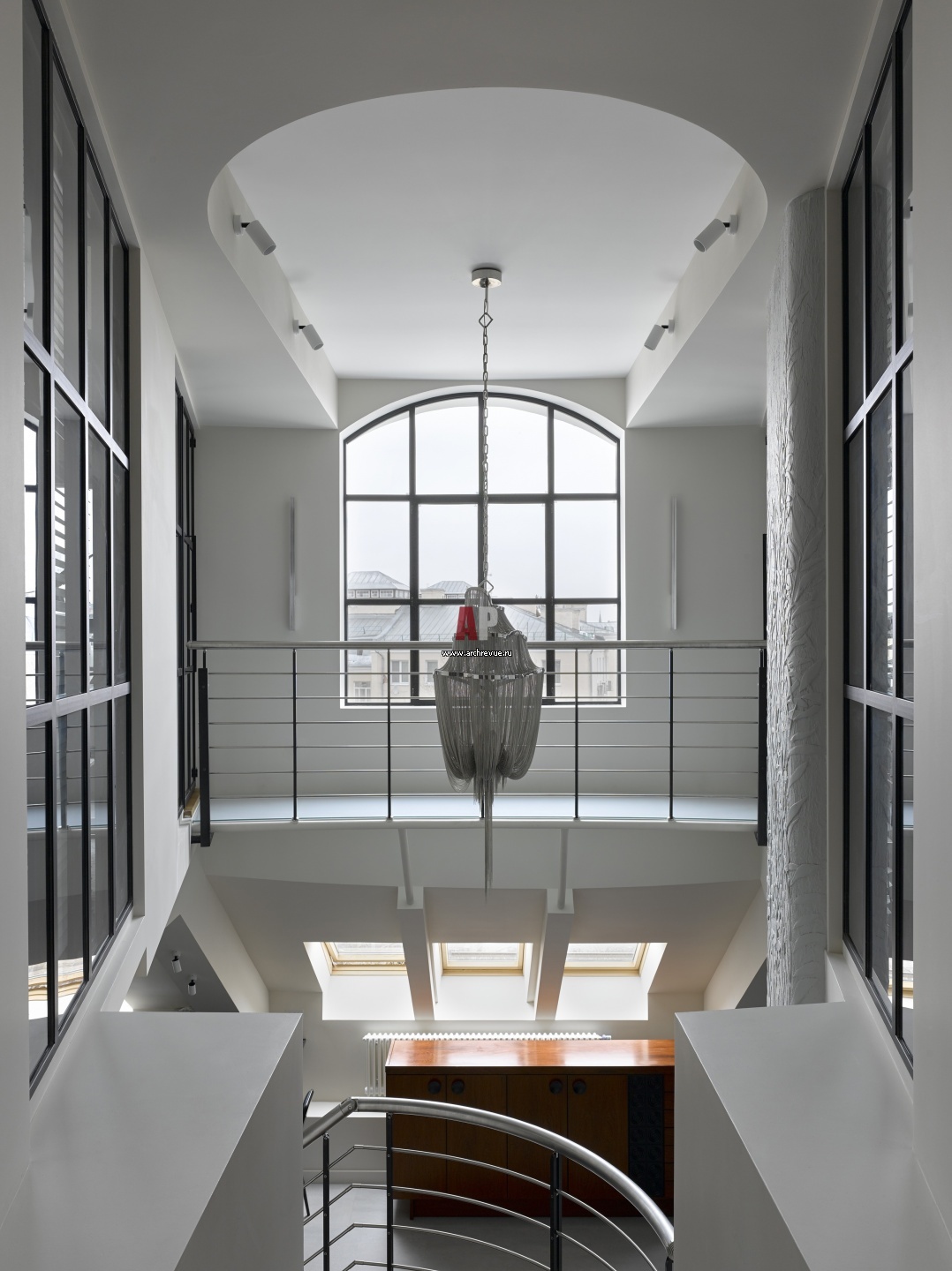 Вид из хозяйской спальни на втором этаже на двухуровневое пространство. Слева и справа размещаются детские, они соединены галереей-мостом.