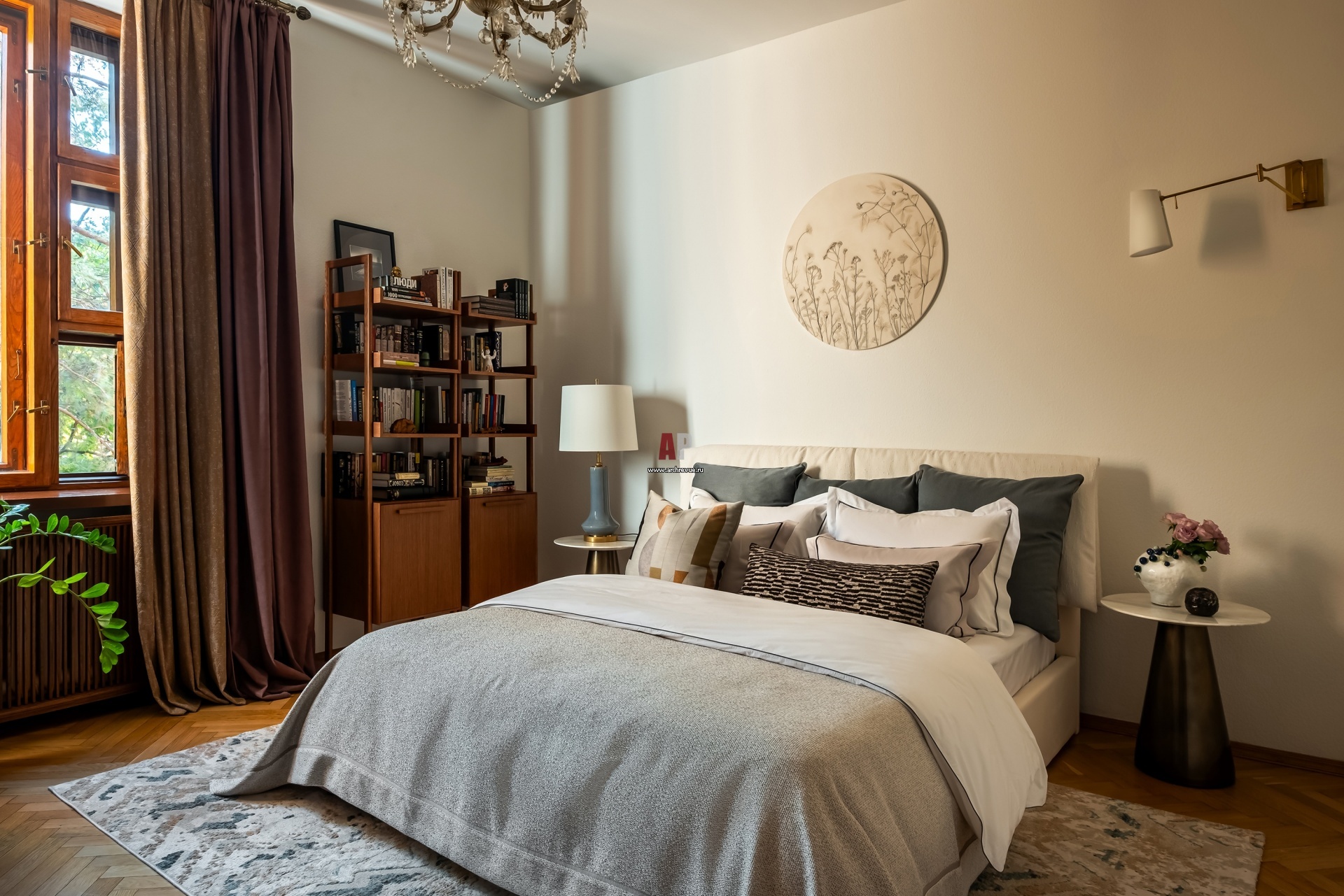 В спальне появились прикроватные столики с мраморной столешницей, стеллаж, выполненный в шпоне дуба, и гипсовое панно. На изголовье сшили декоративный чехол для придания дополнительного объема и высоты.