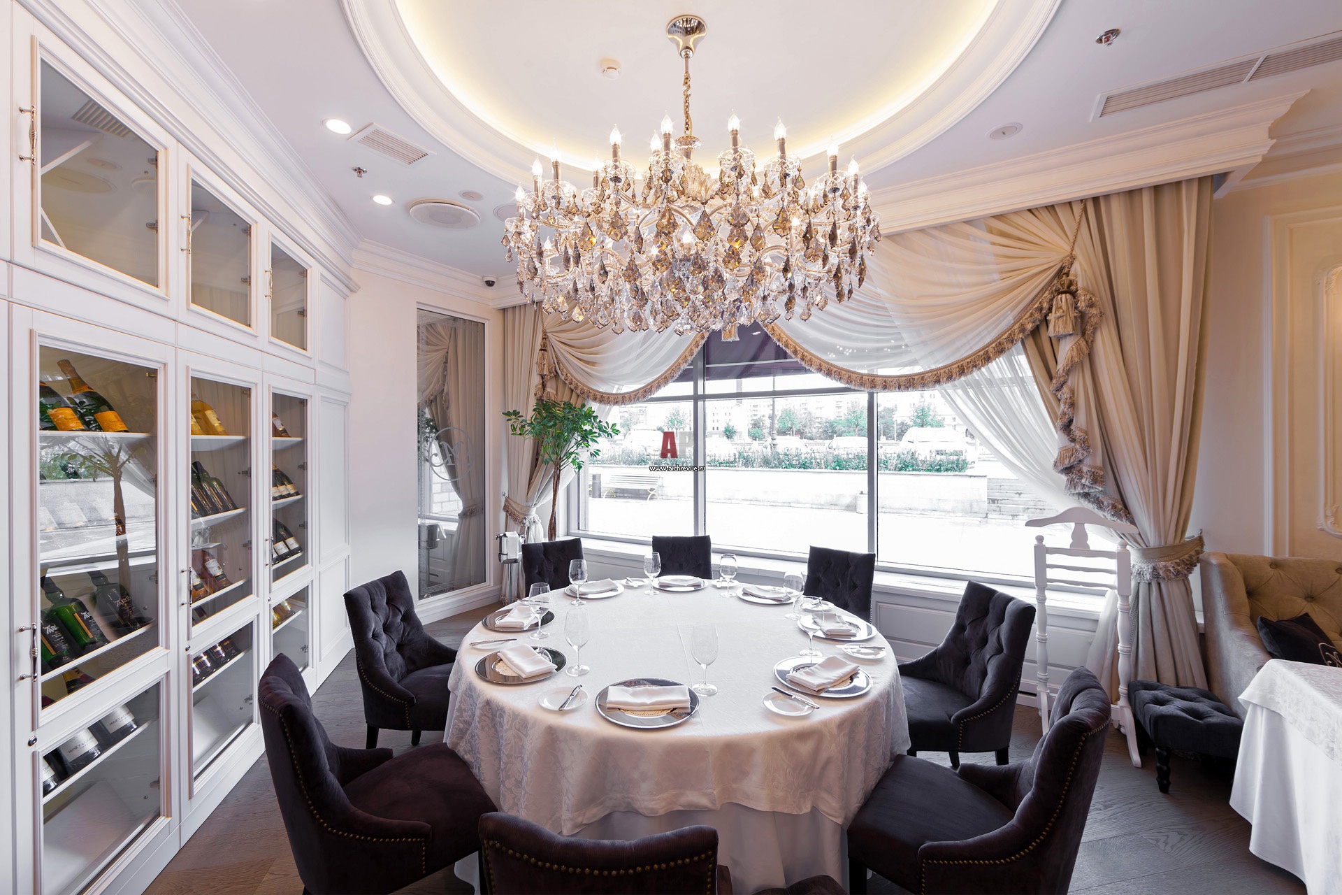 Фото интерьера классического ресторана в светлых тонах. Посадочная зона у окна.