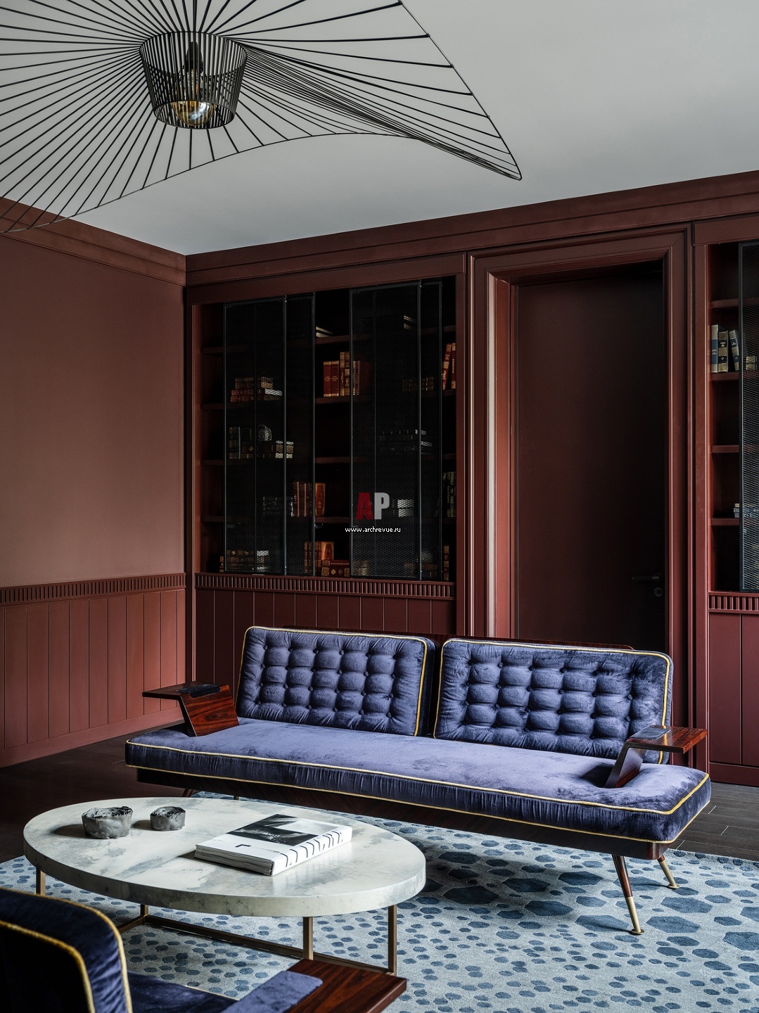 Стеновые панели-буазери бордового цвета, фиолетовые диваны и парящая люстра из гнутого металла в библиотеке отсылают к эстетике mid century. Ковер, O&A London.