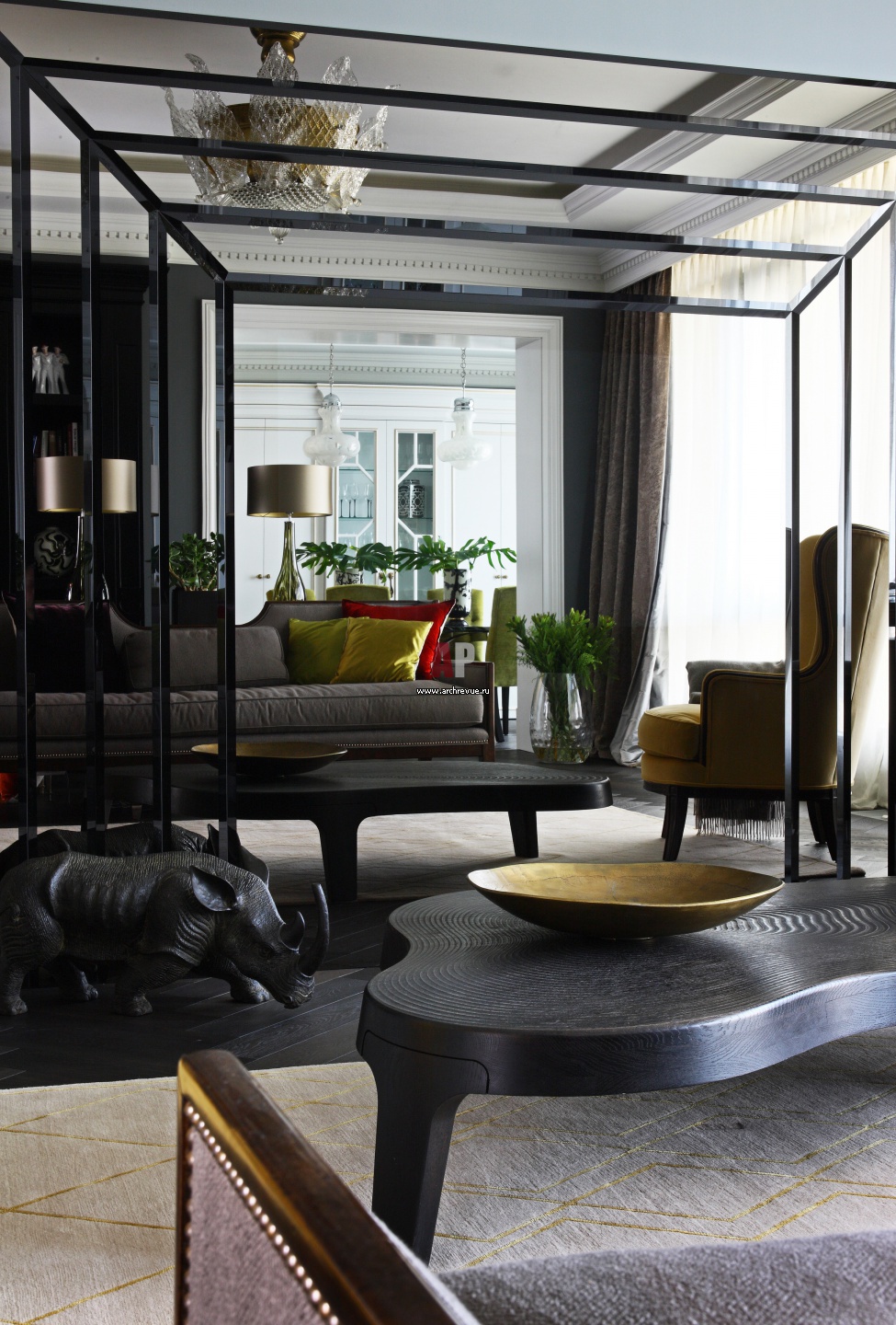 В зеркальном портале отражается серый с яркими акцентами интерьер гостиной. Большая зеркальная плоскость с фацетированными элементами имитирует портал камина и скрывает экран ТВ.