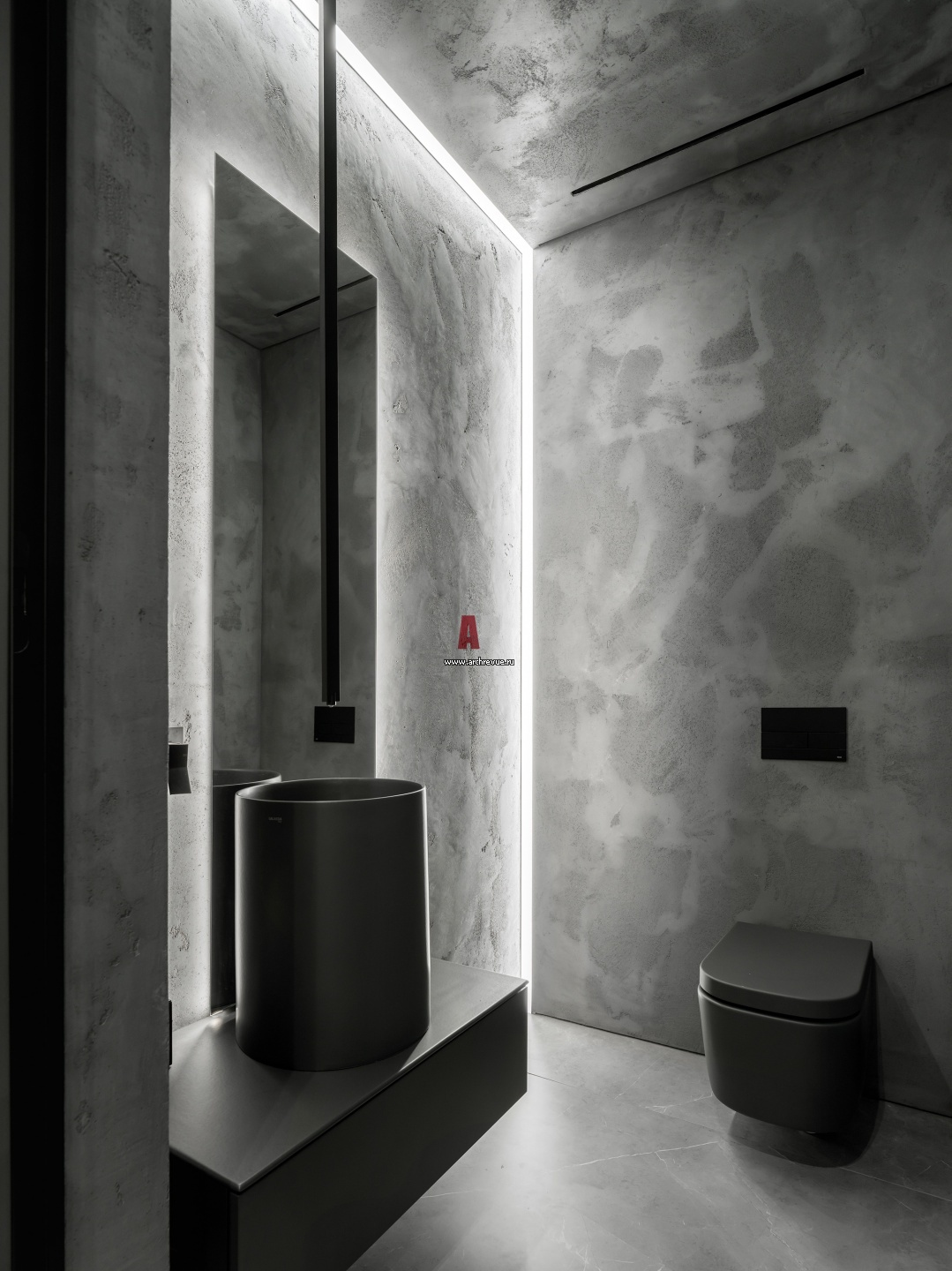 Самым брутальным получился гостевой санузел. Стены и потолок тонированный бетон. Черная сантехника, раковина, Gallasia.