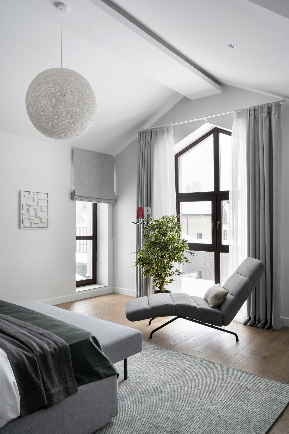 Хозяйская спальня с панорамным окном. Инженерная доска, дуб, Coswick. Шезлонг, Kebe.