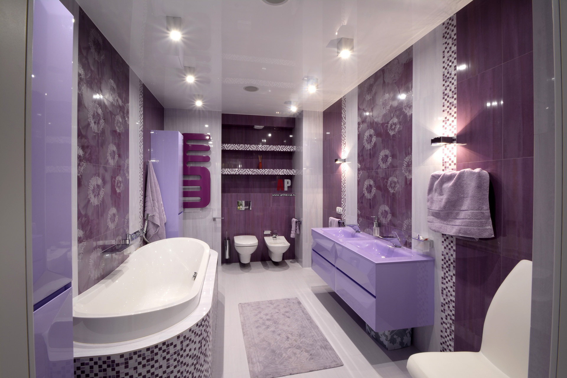 Фото интерьера современной ванной комнаты в сиренево-лиловой цветовой гамме. Примыкающая к стене ванна облицована мозаикой трех цветов: темно-сиреневого, розового, лилового.