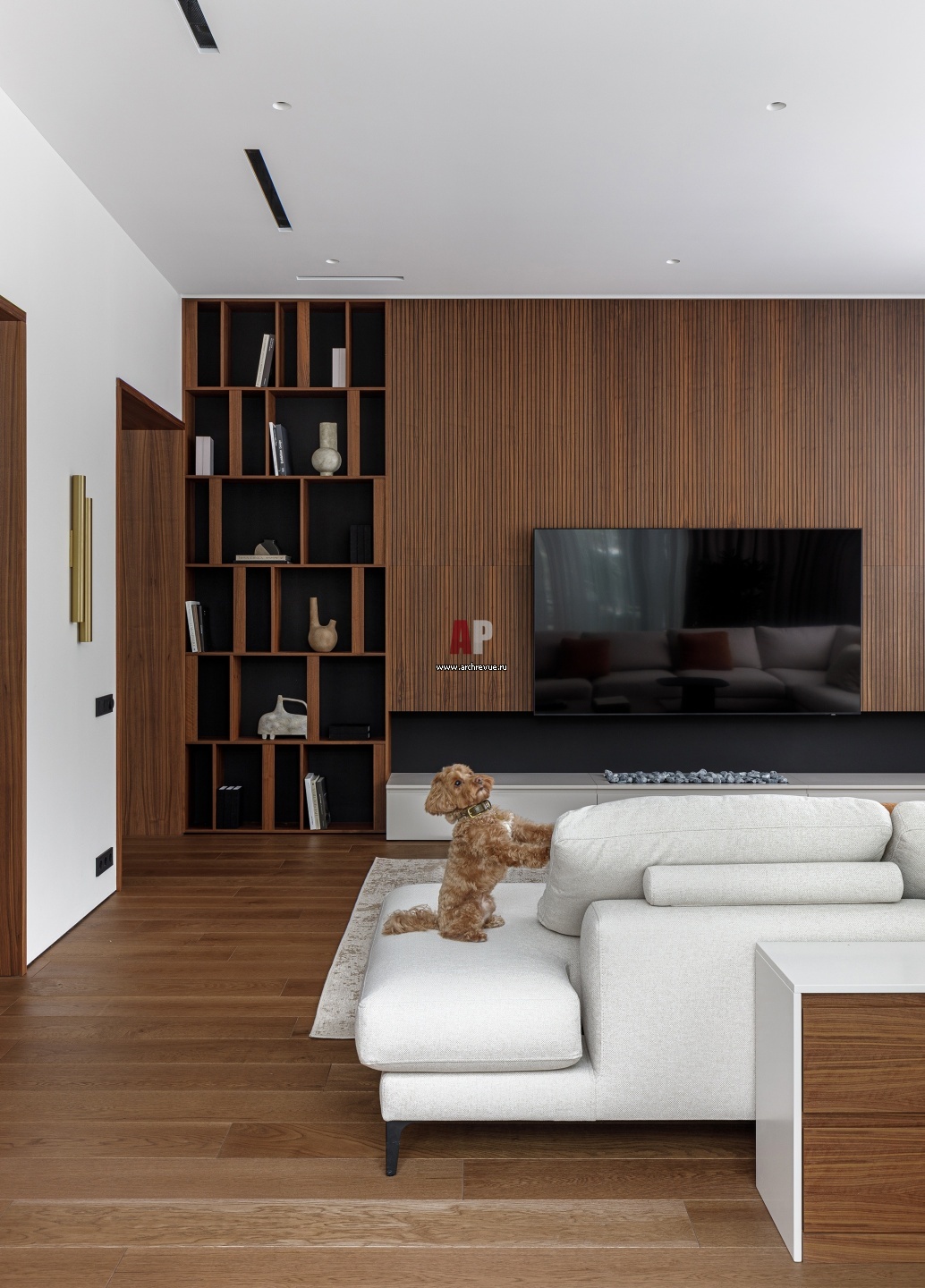 Гостиная. Мягкая мебель, Mononova. Зона ТВ выделена стеновые панелями из деревянных реек с открытыми стеллажами.