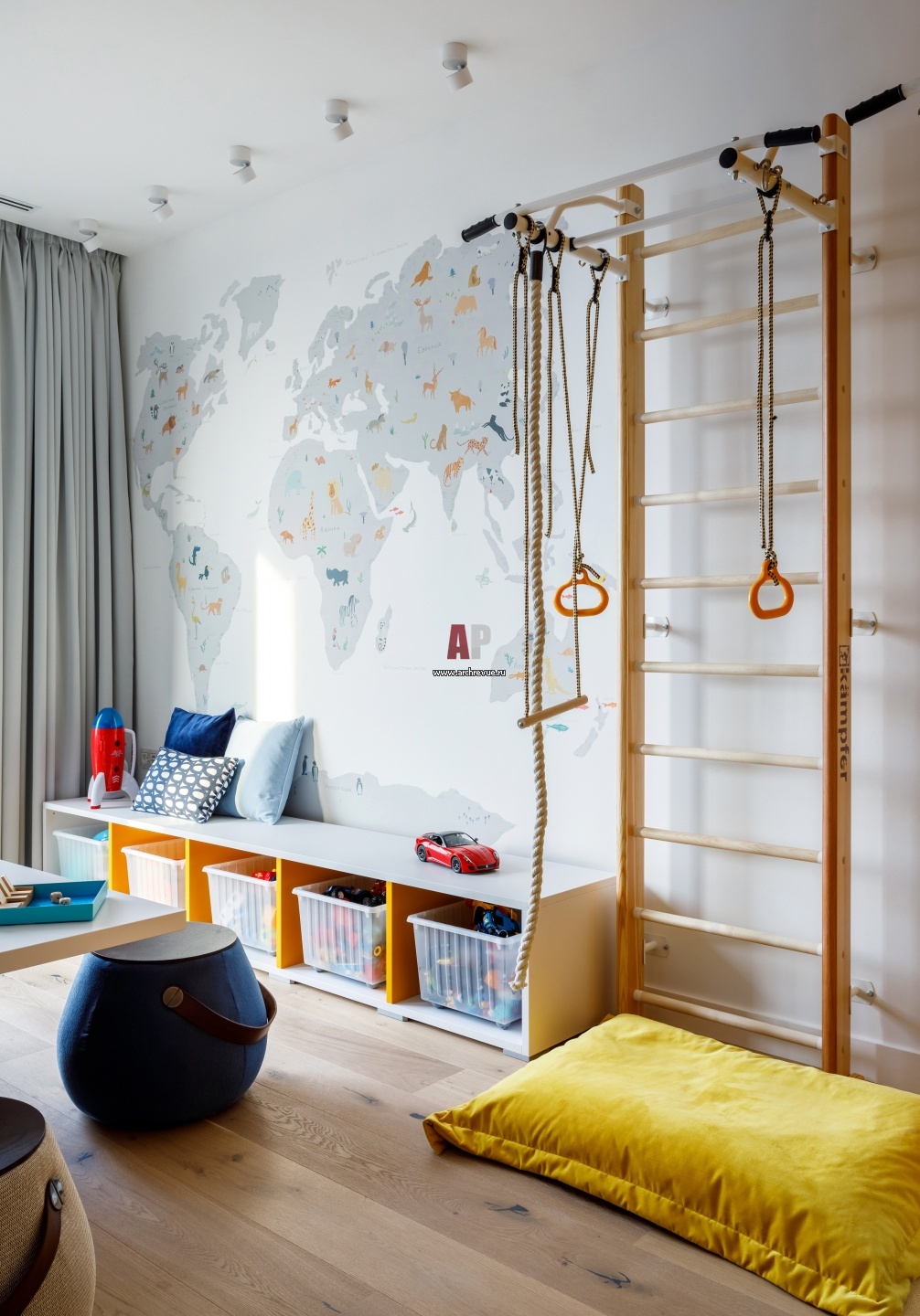 Интерьер детской. Игровая зона со шведской стенкой. Карта на стене с изображением различных животных придумана дизайнером вместе с художником Алексеем Мазановым.