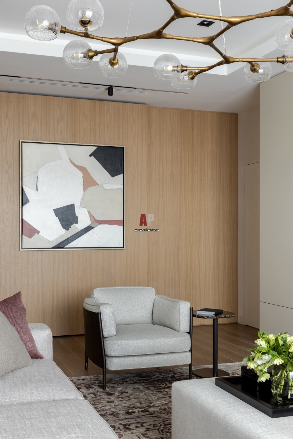 Стена напротив окна в гостиной оформлена светлыми деревянными панелями. Фактура дерева «утепляет» строгий современный интерьер. Кресло, Minotti. Потолочный светильник, Arteriors. Картина, художник Кристина Агельская.