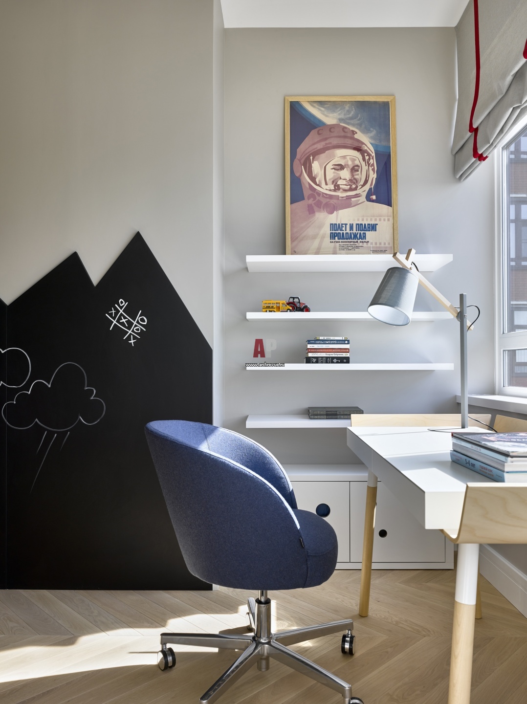Рабочая зона в детской. Кресло, Montbel. Стол, Emko. Оригинальная афиша к научно-популярному фильму «Полет и подвиг продолжая», 1986 год.