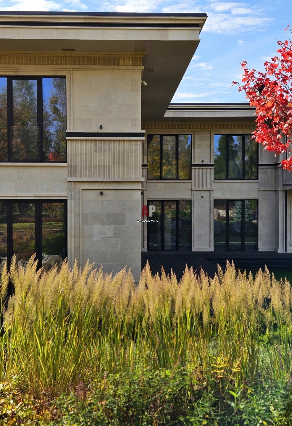 Большими куртинами перед домом высажены злаки, шалфей, котовник