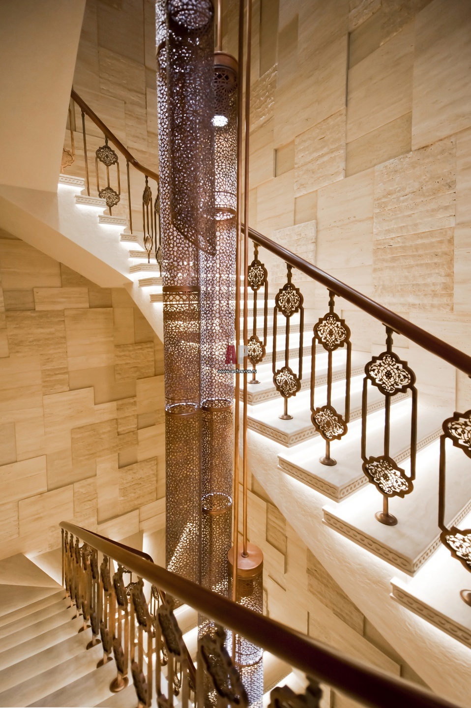 Интерьер лестничного холла. Цилиндрические светильники сделаны по эскизам авторов проекта из перфорированного металла.