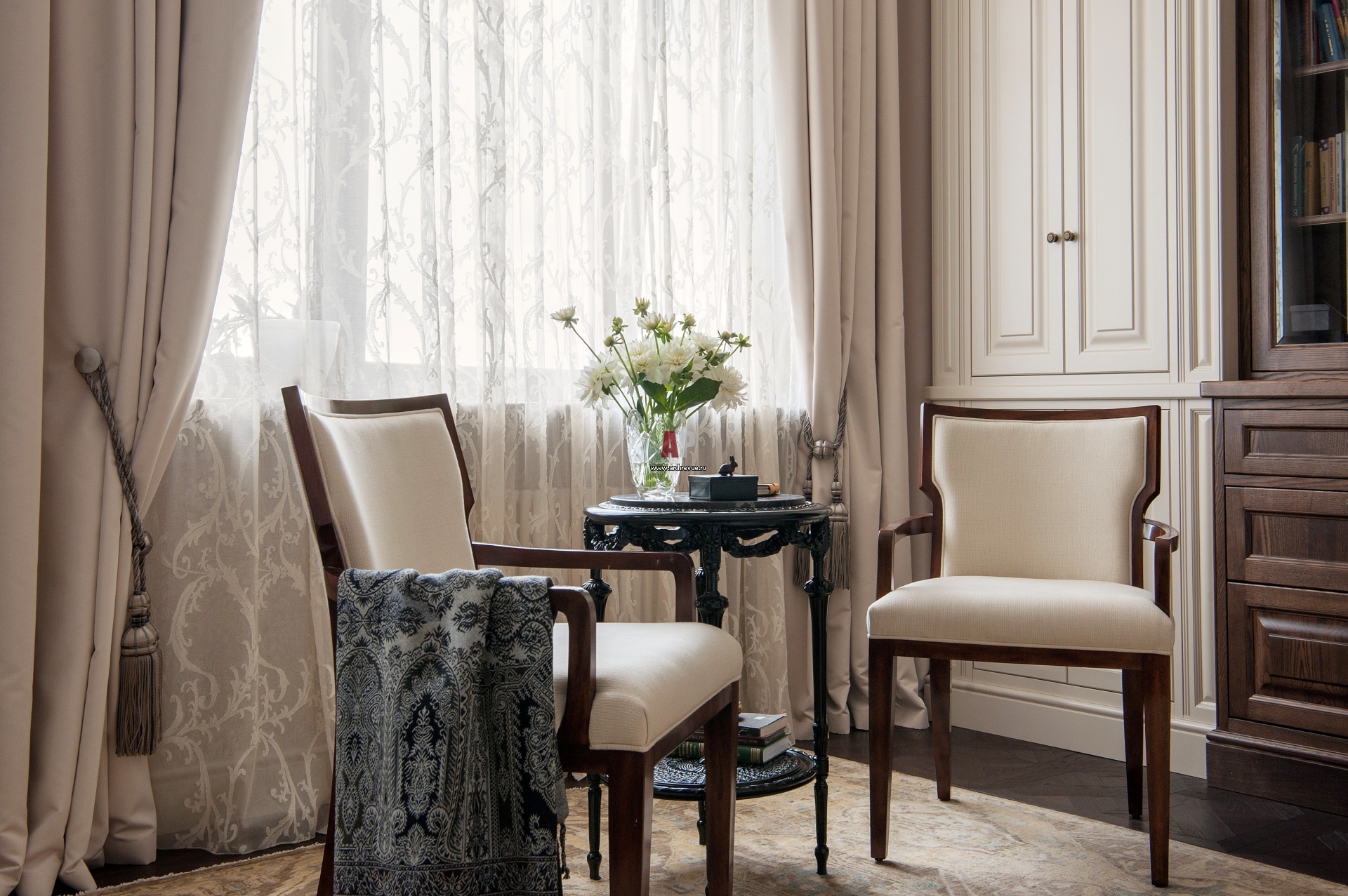Зона отдыха в спальне. Кофейный столик, GF Ferre Home. Стулья, Century Furniture. Портьеры, Gaston y Daniela (Испания). Тюль, Morton Young & Borland (Великобритания).