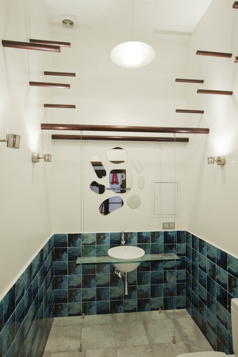 Зеркало в гостевом санузле собрано из фрагментов. Подвесные деревянные бруски изготавливались по эскизам авторов проекта.