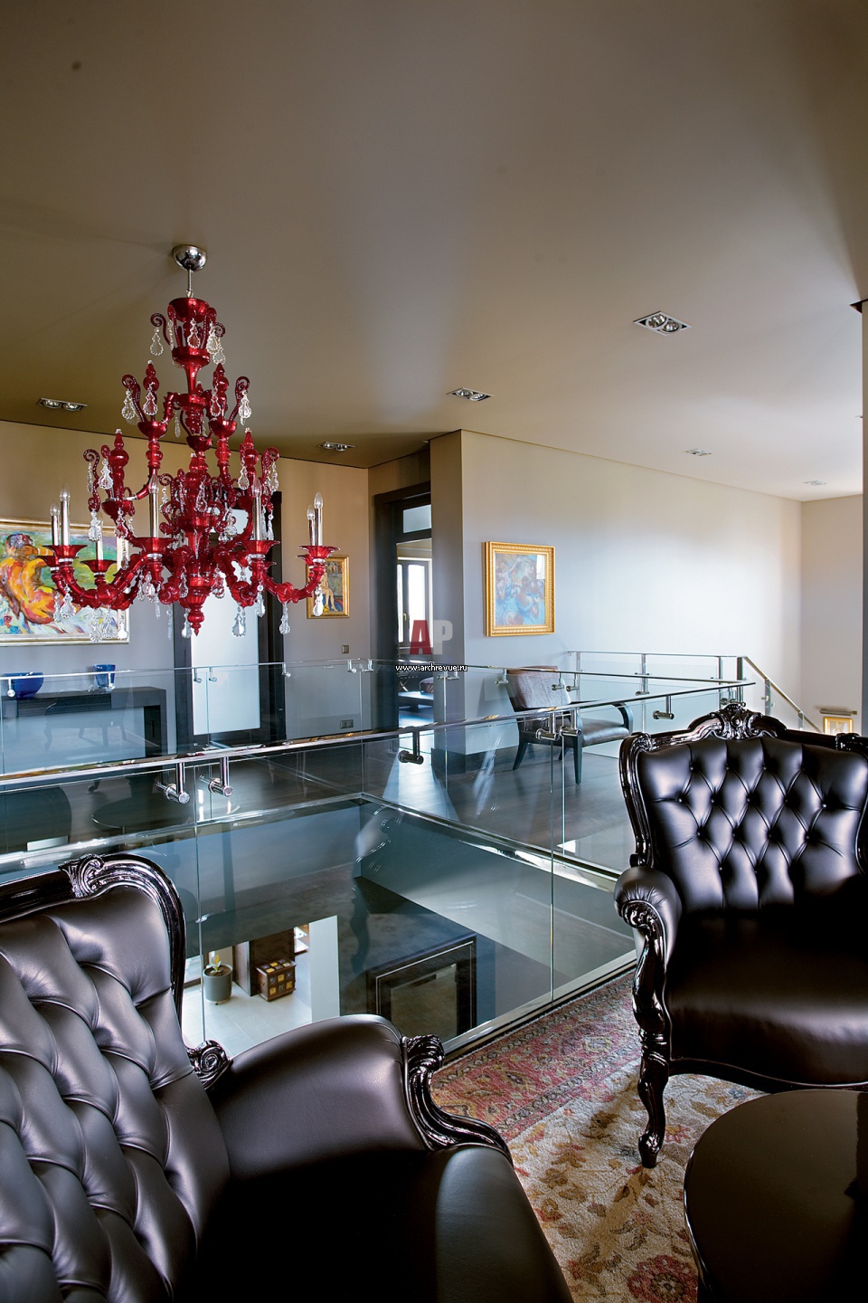 Чилл-аут с черными необарочными креслами в холле второго этажа.