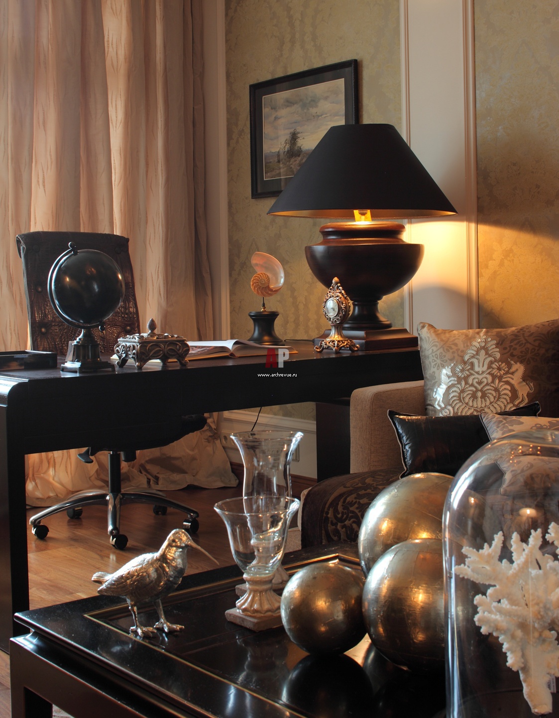По желанию заказчиков в общей зоне появился рабочий стол хозяина. Рабочему месту хозяйки дома решено было отвести место в спальне.