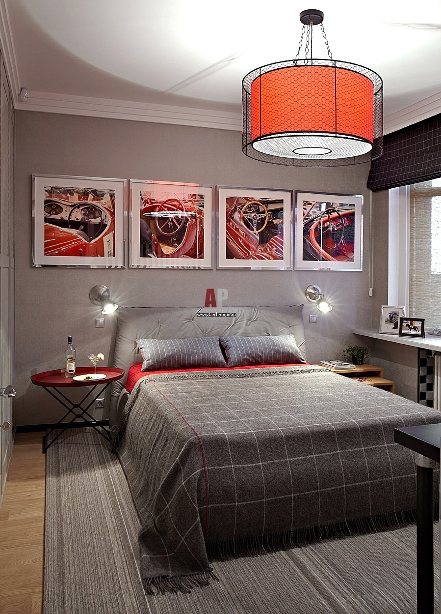 Отдельно в квартире выделена спальня. Она выполнена в общей серой гамме с насыщенными красными акцентами. На стене за изголовьем кровати – коллекционные фотографии, привезенные архитектором из Парижа. Кровать, Pianca.