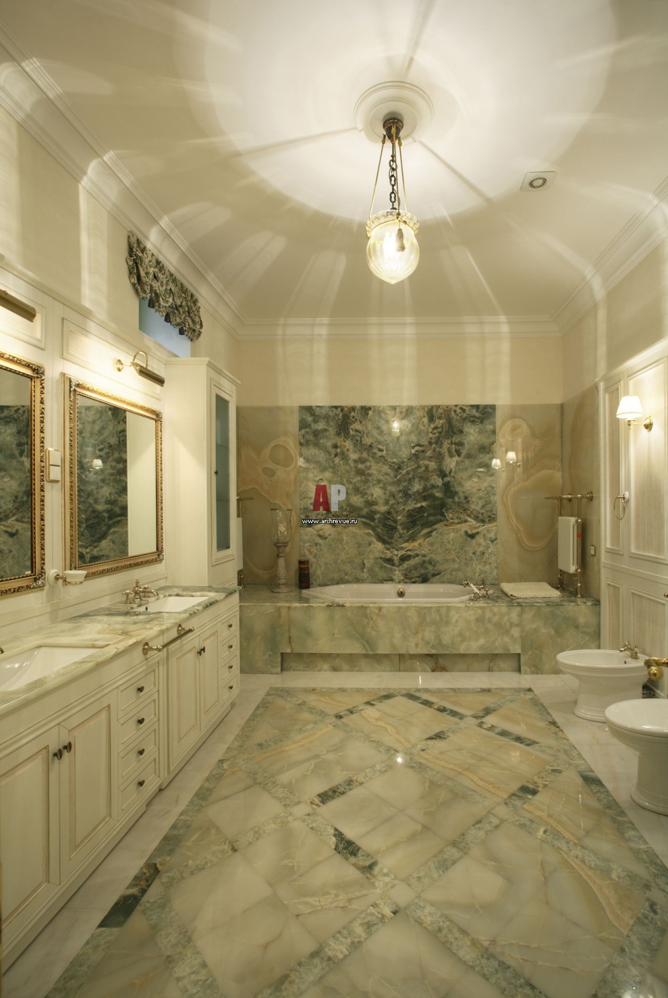 Хозяйский санузел облицован слэбами из белого и зеленого оникса с естественным рисунком. На полу – мозаичный ковер из оникса разных оттенков. Сантехника Villeroy & Boch.