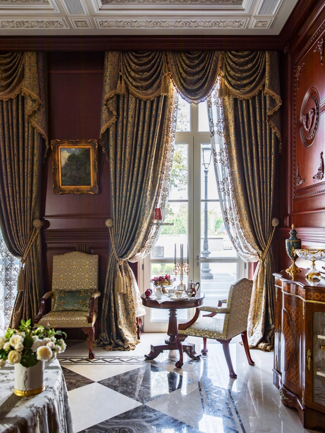 Фрагмент парадной столовой со столом на 24 персоны. Кофейный столик, Maitland Smith. Стулья, Arthur Brett. Консоль, Francesco Molon. Шторы из ткани Rubelli. На полу – черно-белый мрамор.