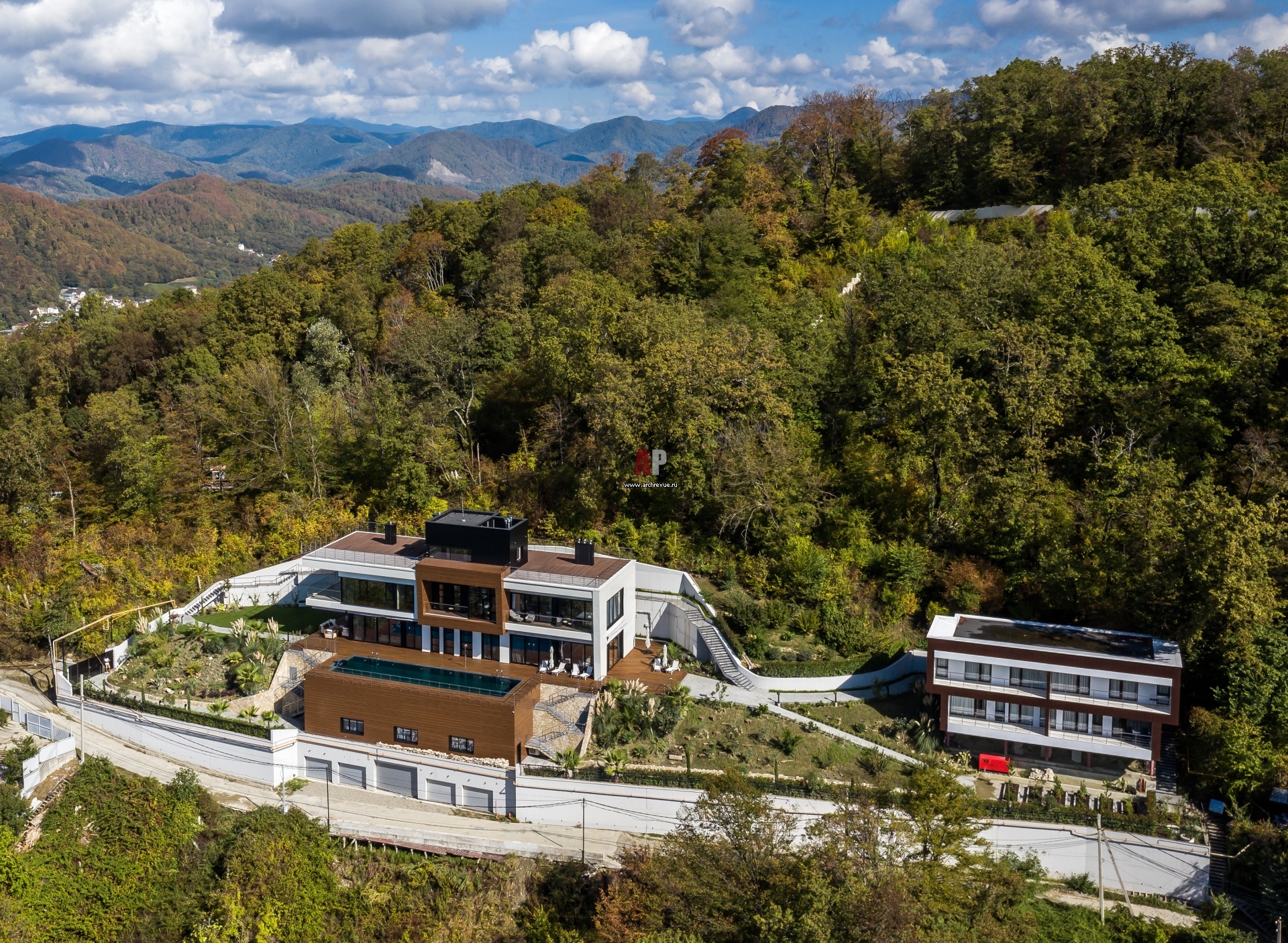 Дом построен на сложном рельефе. Парковка находится на девять метров ниже первого этажа дома, в цокольной части под землей, а за жилыми этажами возвышается большая подпорная стена, поддерживающая верхний склон.