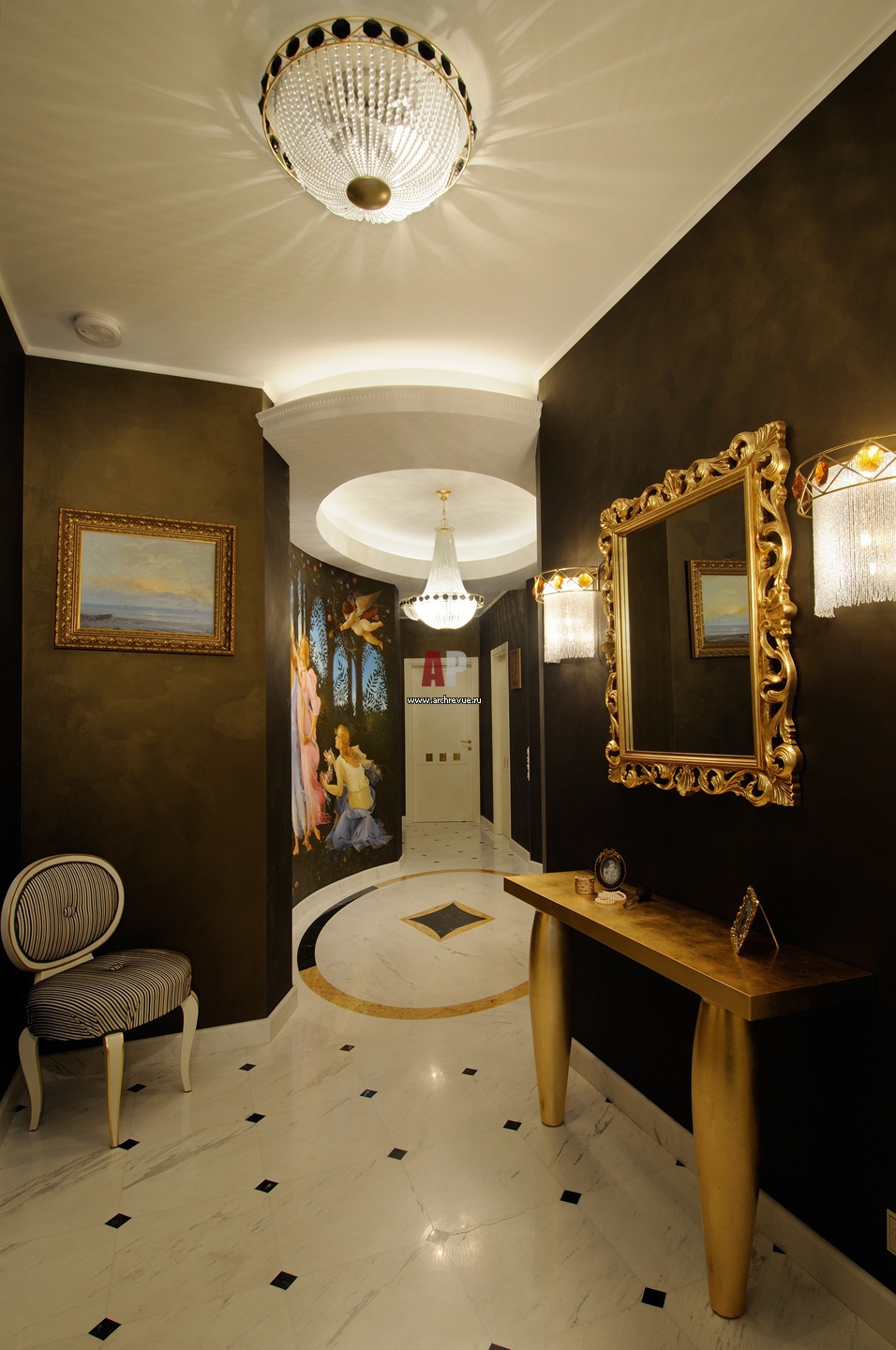 Стены прихожей отделаны декоративной штукатуркой с бархатной фактурой сложного травянисто-зеленого с золотым цвета, изготовитель «Италдекор». Интерьеры квартиры оформлены живописными полотнами художников Владимира Жука и автора проекта Анны Гусаровой.