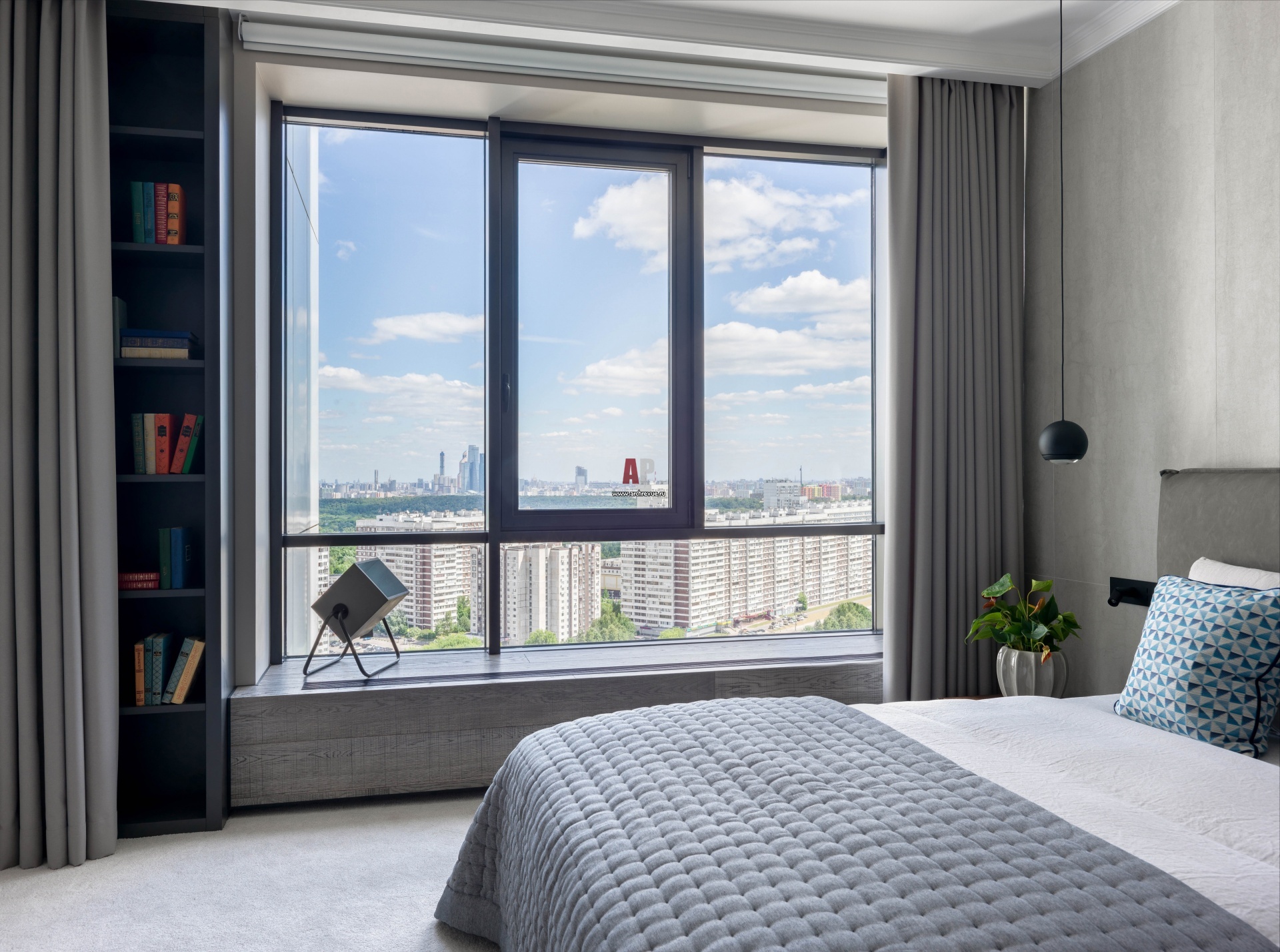 Интерьер спальни. Низкий подоконник зашит доской из седого дерева. На подоконнике – прожектор, Zuiver. Книжные стеллажи скрыты за шторами.