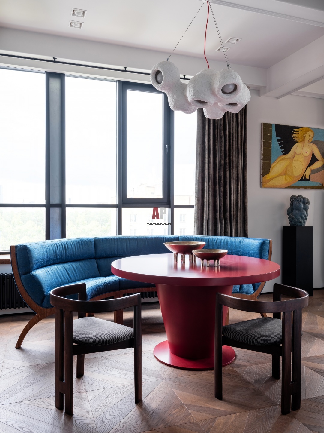 Столовая группа в ретро-стиле. Круглый диван обит синим винтажным бархатом Rubelli. Обеденный стол сделан на заказ. Паркет в гостиной с экстравагантным модулем и ритмичной раскладкой.