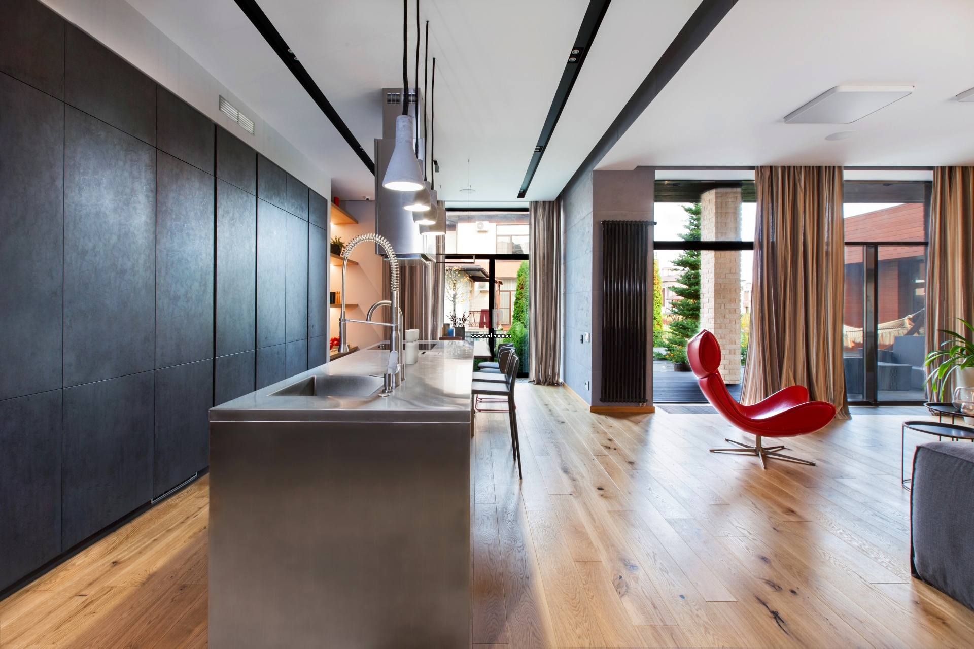 Интерьер современного дома для молодой семьи. Общей идеей проекта является лаконичный декор, отсутствие лишних деталей, открытых шкафов и полок, дверных наличников, карнизов, плинтусов. Акцент делается на чистоту линий и объемов, а также фактуры материалов.