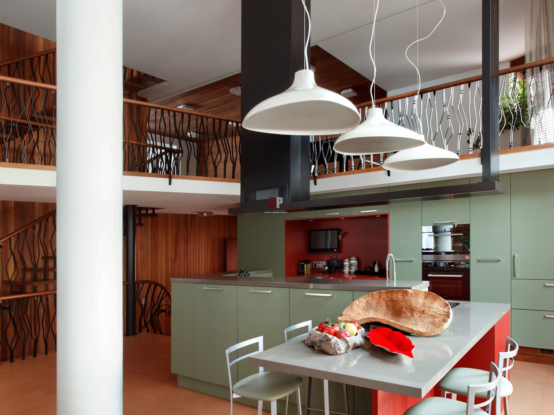 Фасад современной кухни решен в нежно-фисташковом цвете. Столешница барной стойки выполнена из композитного материала в тон к ней. На полу – крупноформатная плитка терракотового цвета, CottoVeneto.