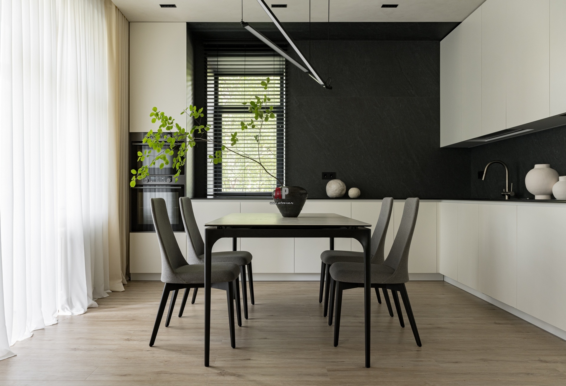 В кухне клиентам был важен максимальный комфорт, поэтому столовая группа лаконична по форме и практична по материалам. Стол обеденный с керамической столешницей Silhouette и стулья Etoile – все Calligaris.