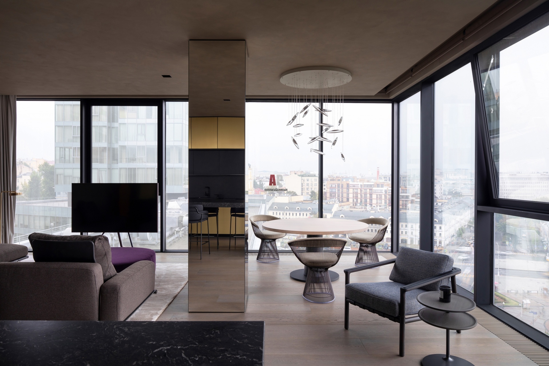 Гостиная с панорамным остеклением. Кресла, Molteni&C, модель Gillis. На полу – инженерная доска, Greenline, цвет «Индус Грей». Светильники, Erco.