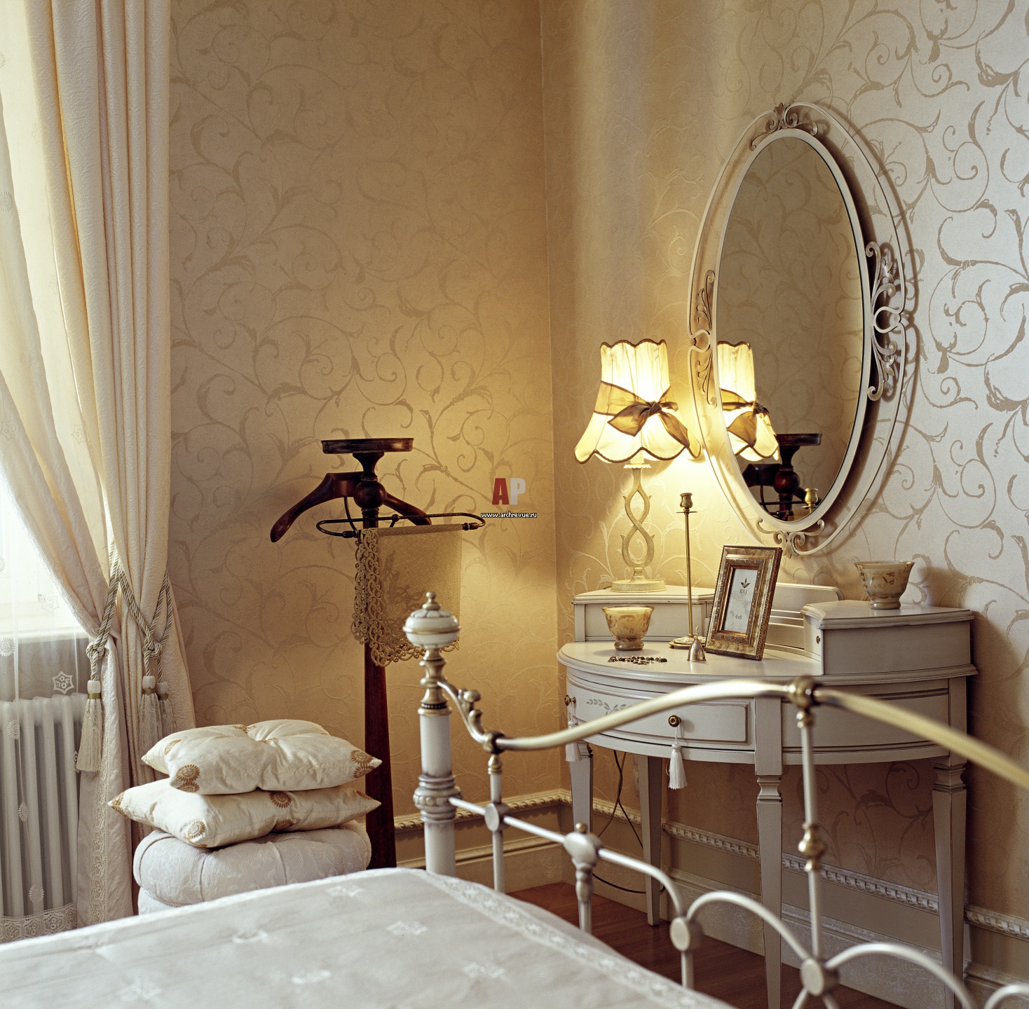Зона будуара в спальне. Полукруглый столик для макияжа цвета слоновой кости, Bova.