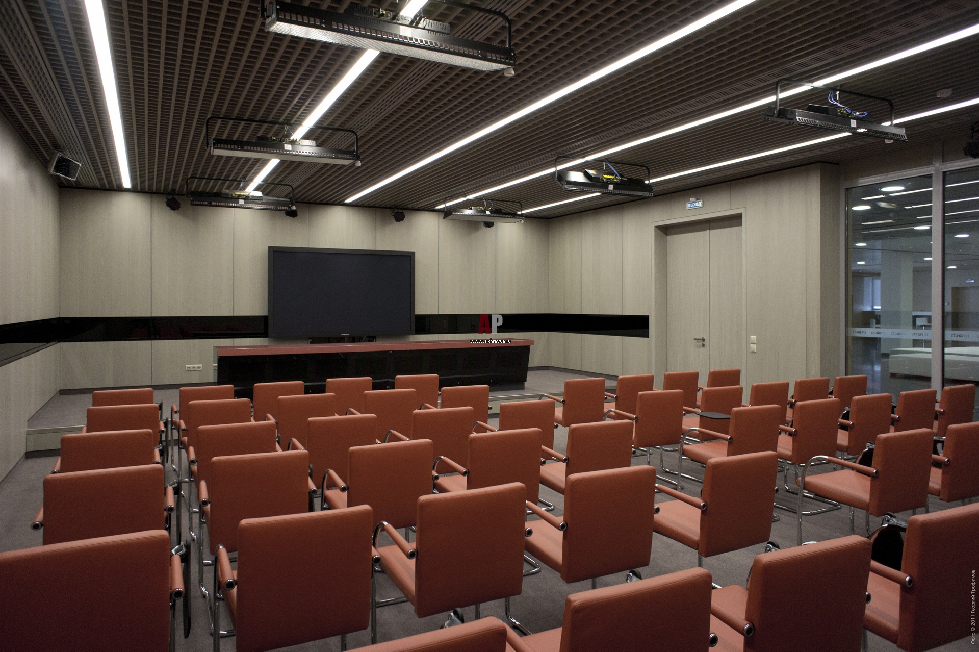 Малый зал для переговоров. Подвесные потолки из ячеистого металла SAS International. Оперативная мебель в красной кожаной отделке.