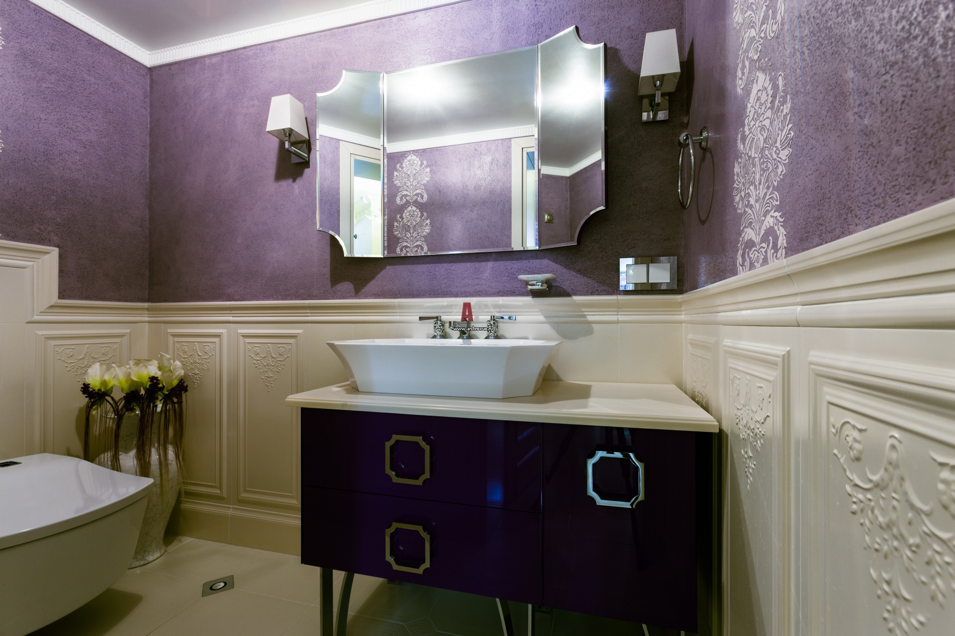 Фото интерьера гостевого санузла. Нижняя часть стен облицована керамическими панелями от Petracer’s, верх отделан декоративной многослойной штукатуркой сиреневого цвета. Умывальник в стиле ар-деко, TOTO.