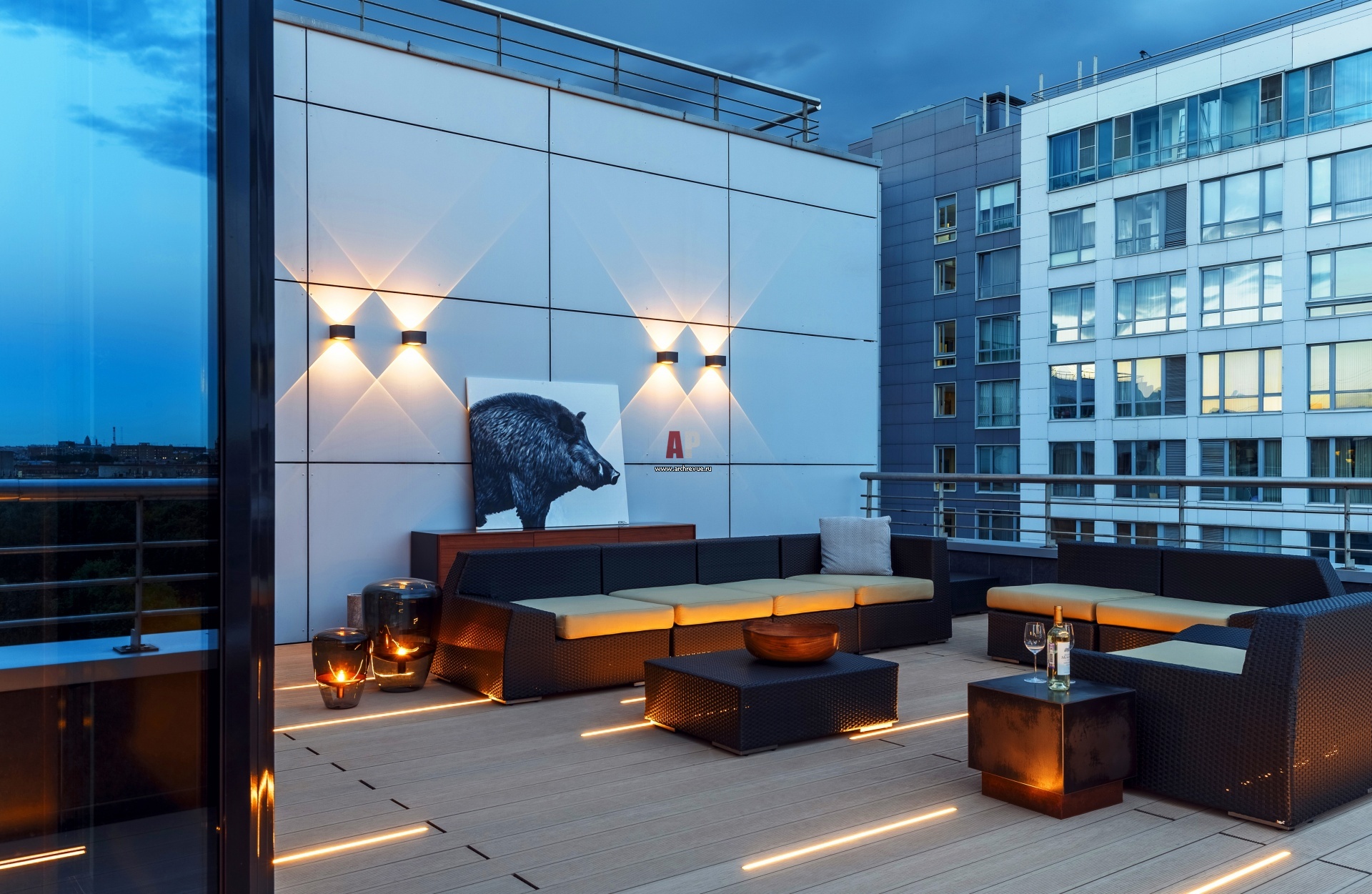 Панорамный пентхаус в Хамовниках. Терраса на крыше. Модульная мебель из ротанга, Atmosphera. Архитектурный свет, Delta Light.
