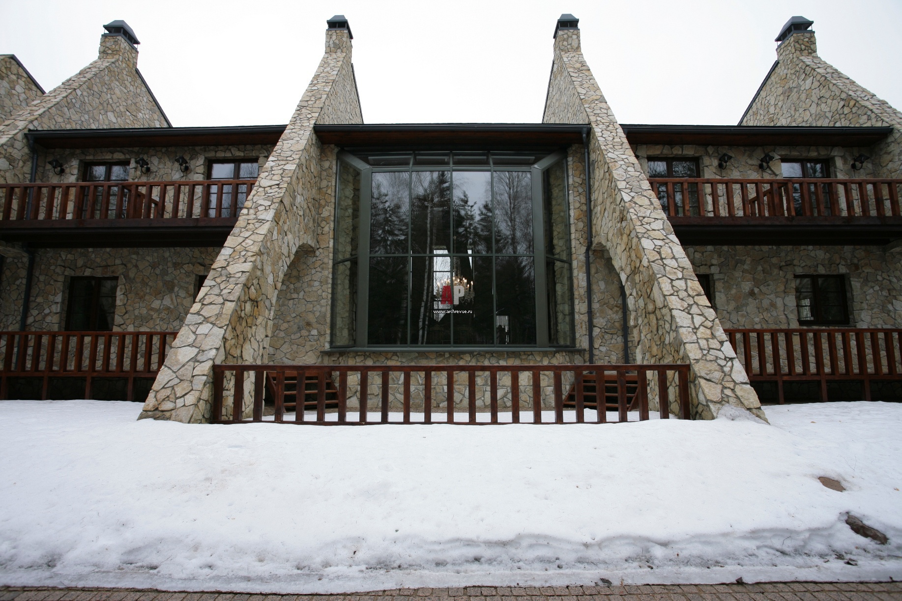 Главный фасад, вдоль которого расположены панорамные оконные проемы и галереи, опирается на выступы-контрфорсы.