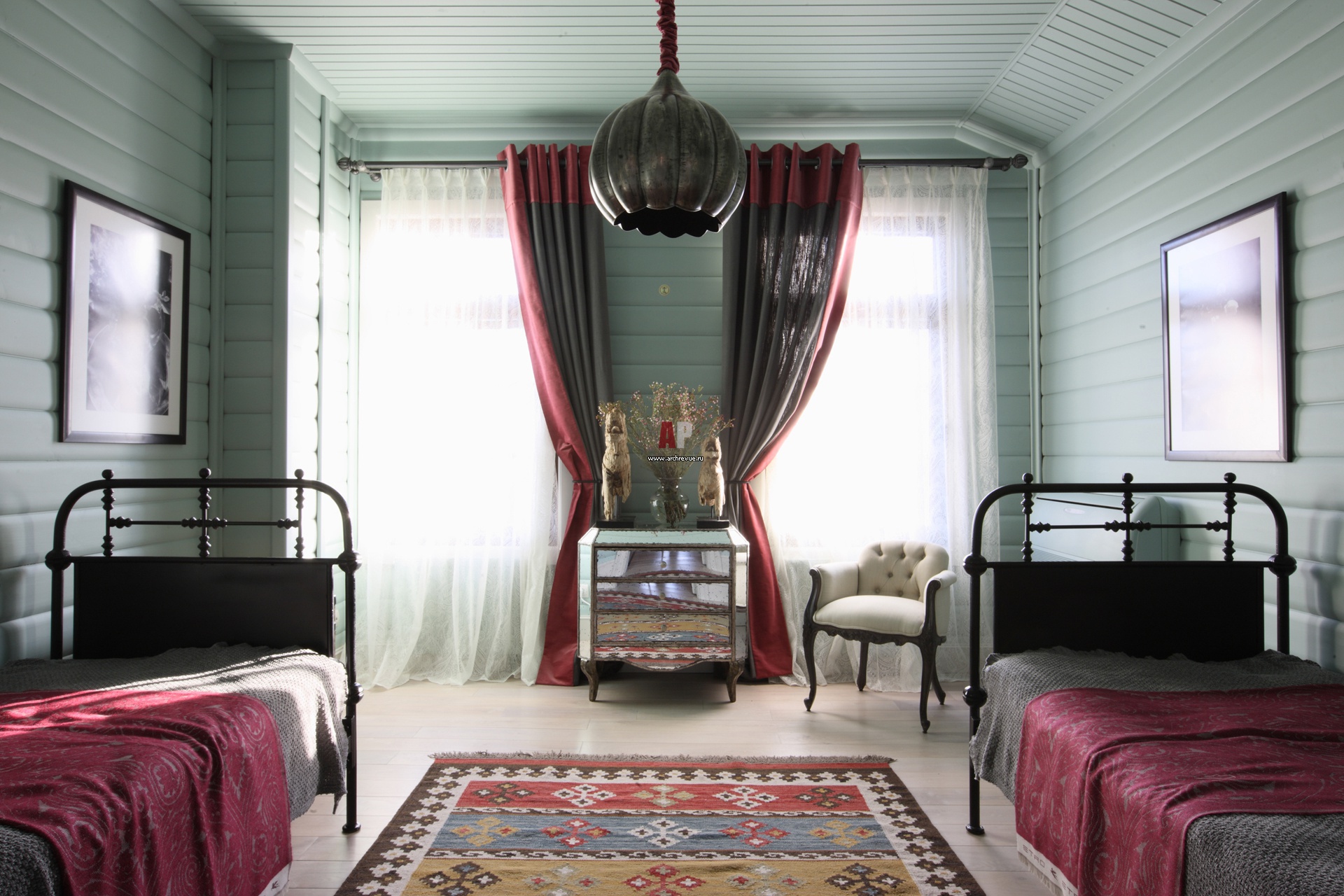 Интерьер гостевой. Шторы из серого льна в сочетании с малиновым бархатом. Легкие занавески – тюль с рисунком «огурцы». Пледы от Etro.