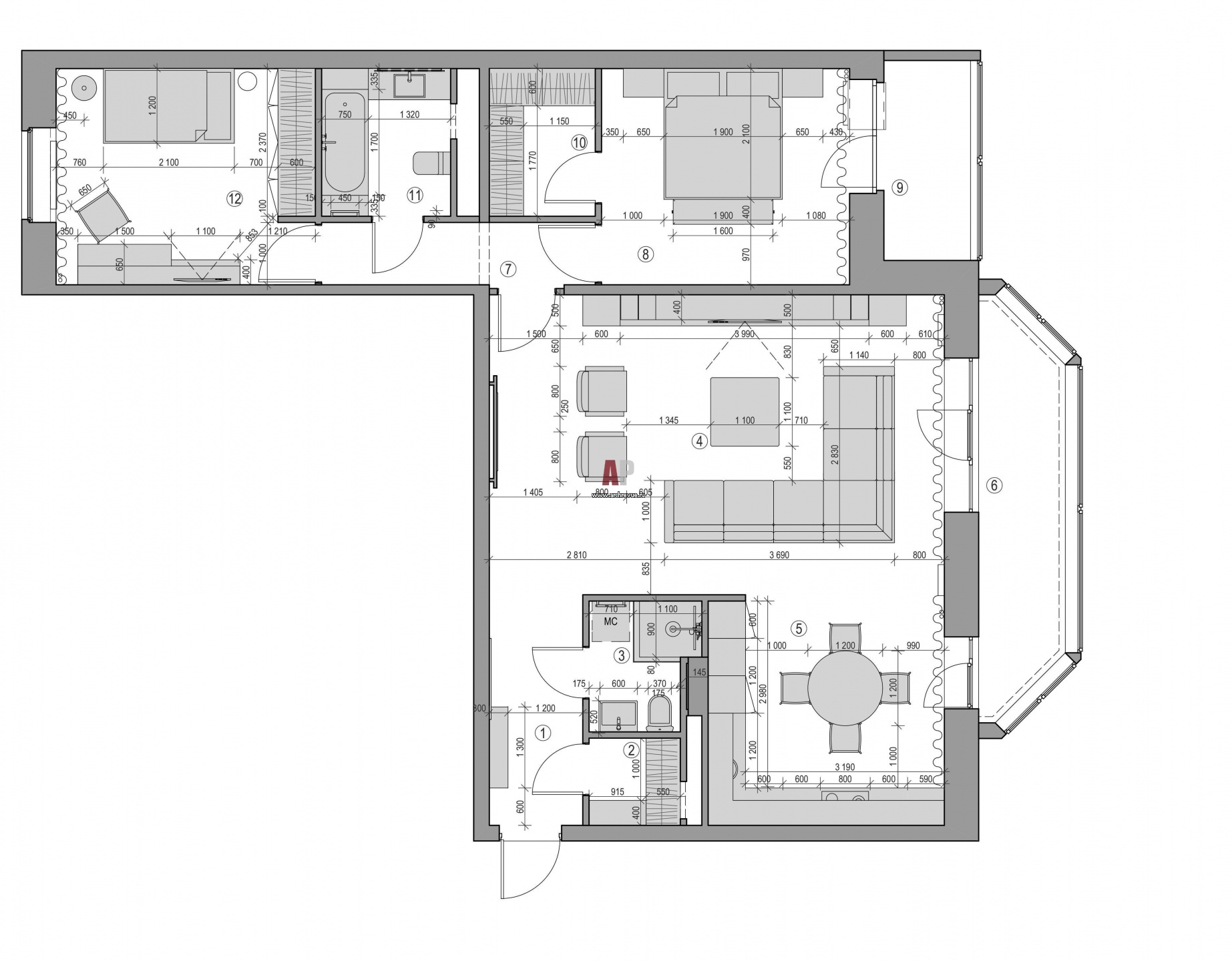 План трехкомнатной квартиры в высотке на Мосфильмовской. Общая площадь – 100 кв. м.