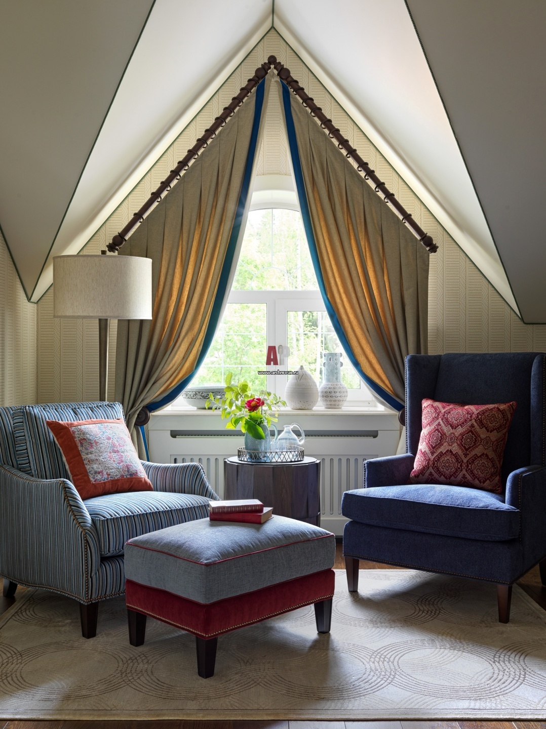 Одна из двух гостевых спален в мансарде. Обои, Anna French. Кресло, Lexington в ткани Fabricut. Кресло, Bernhardt в ткани Fabricut. Столик, Lexington.